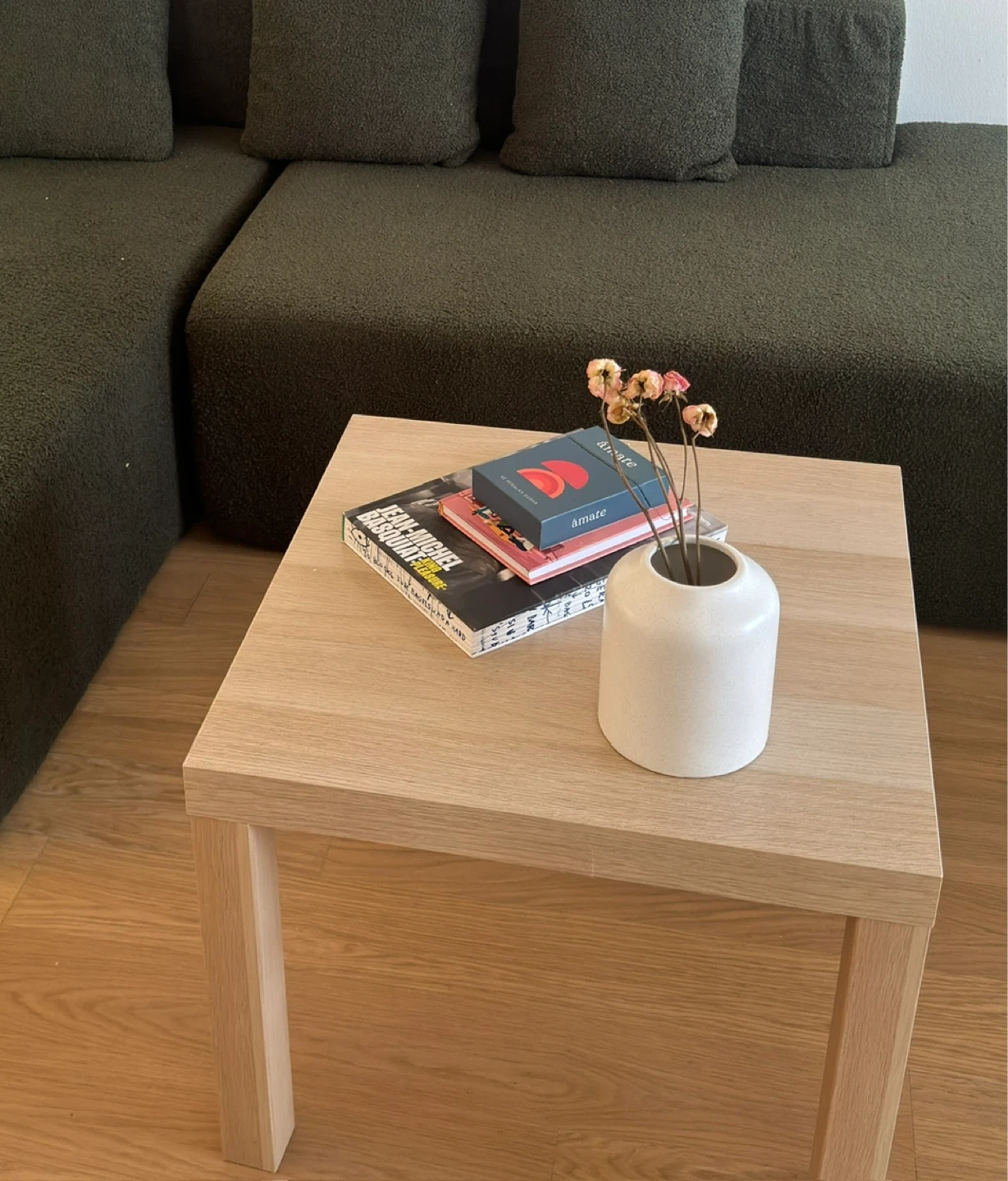 This light wood square coffee table has a clean, minimalist design. Its simple construction makes it a versatile piece for any living space. The smooth wood surface is easy to clean and maintain.