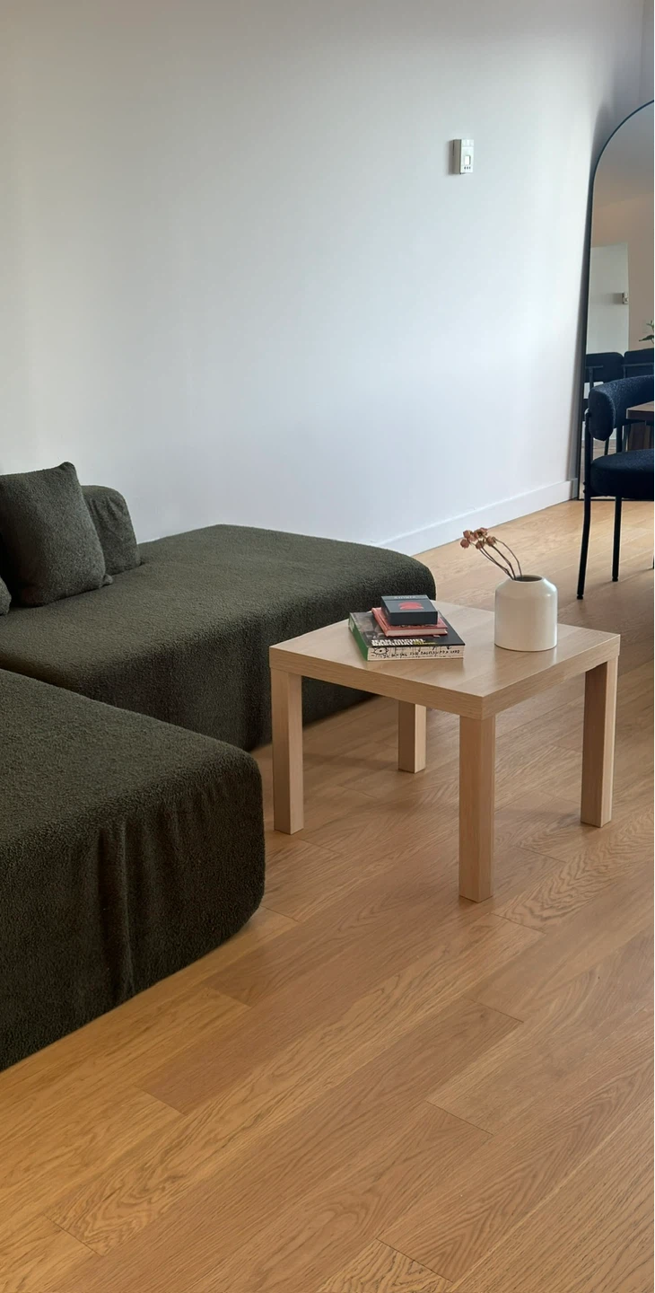 This light wood square coffee table has a clean, minimalist design. Its simple construction makes it a versatile piece for any living space. The smooth wood surface is easy to clean and maintain.