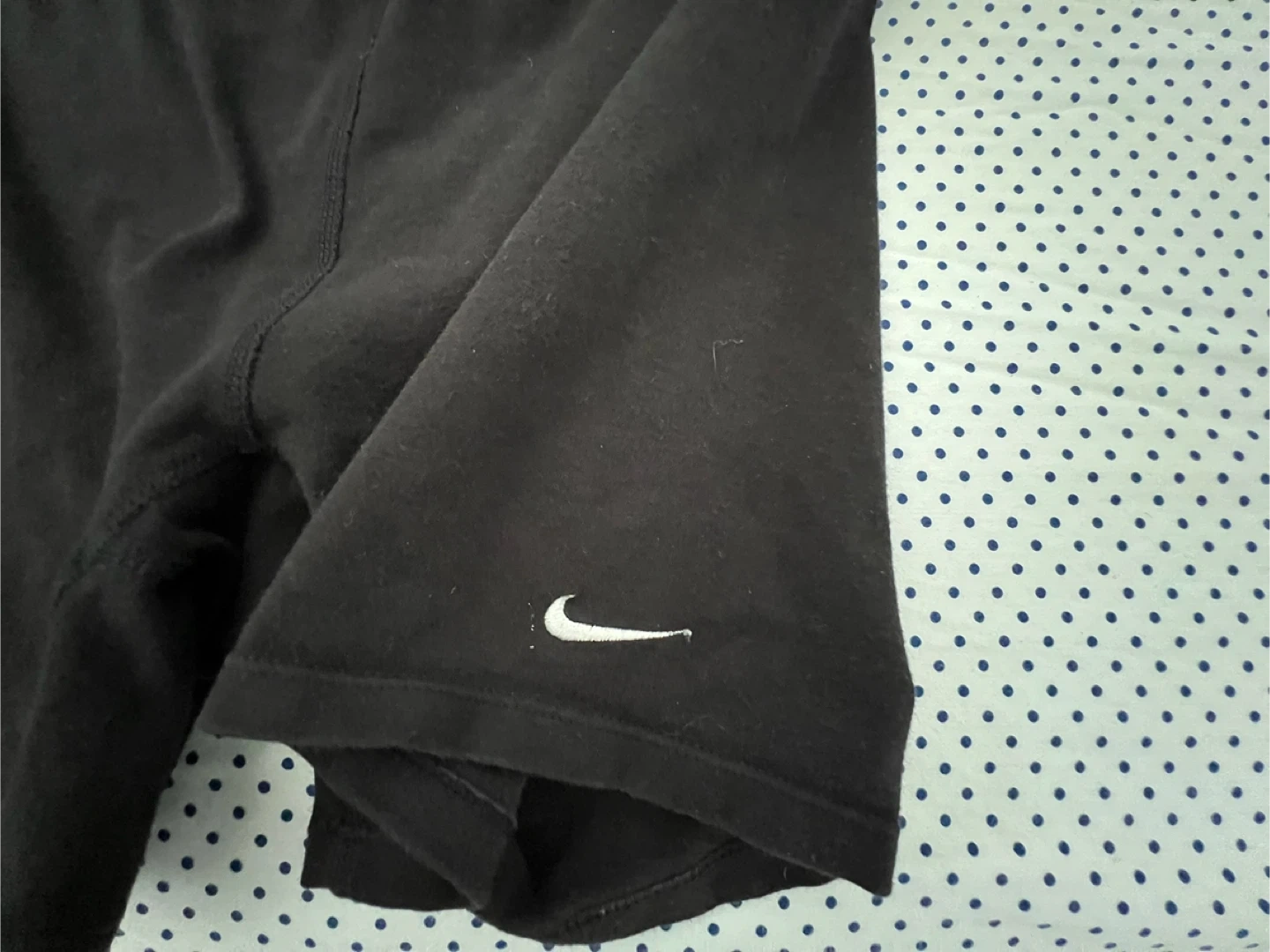 These black Nike athletic shorts are a women's size large. They're made with 90% cotton and 10% spandex for comfort and flexibility. Great for workouts or casual wear!
