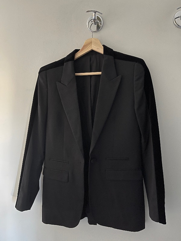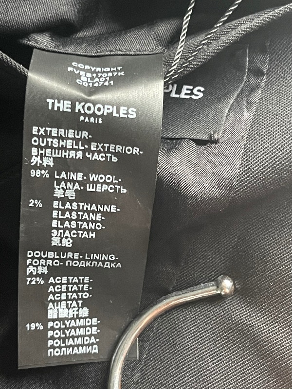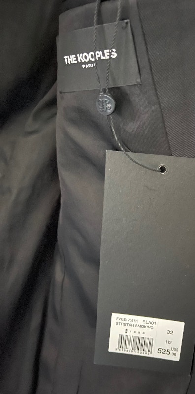Brand new with tags, authentic from French designer brand THE KOOPLES. This is a black stretch smoking jacket in size EU 32 or US 0. THE KOOPLES makes beautiful French fashion, similar to other high-end designer labels like Sandro, Maje, and Ba&Sh.