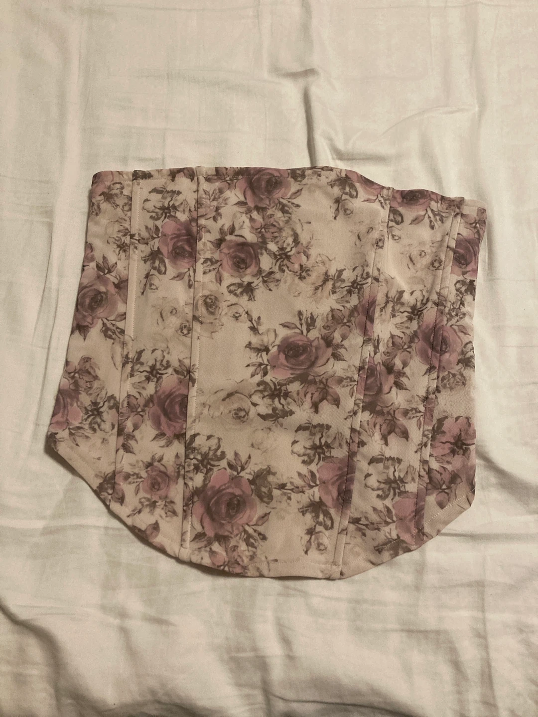 A cute floral print corset top. It's made from a lightweight fabric with boning for structure. This piece adds a lovely touch to any outfit!
