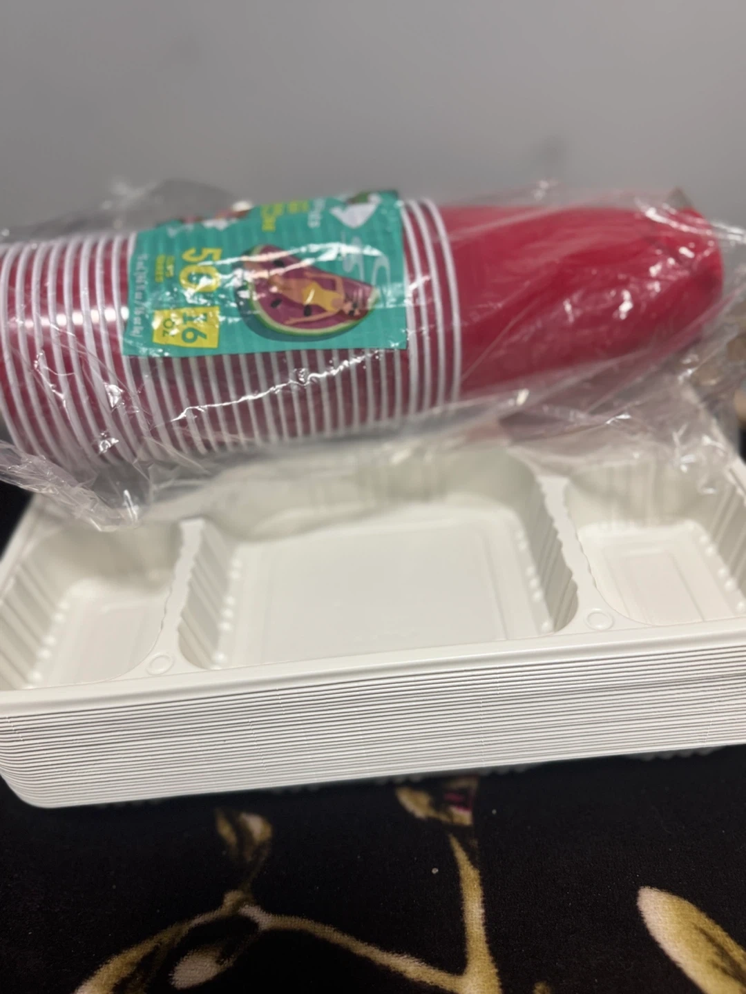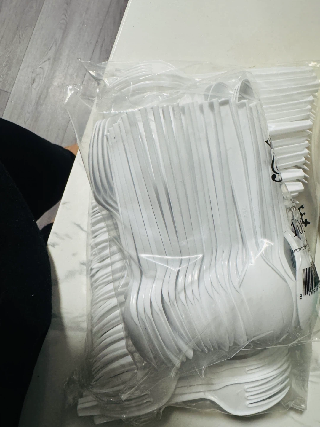 This set includes disposable plates and cutlery. The plates are beige and have a braided rim detail with a debossed logo. Also includes a white divided food tray and a package of white plastic spoons. Perfect for picnics or parties!
