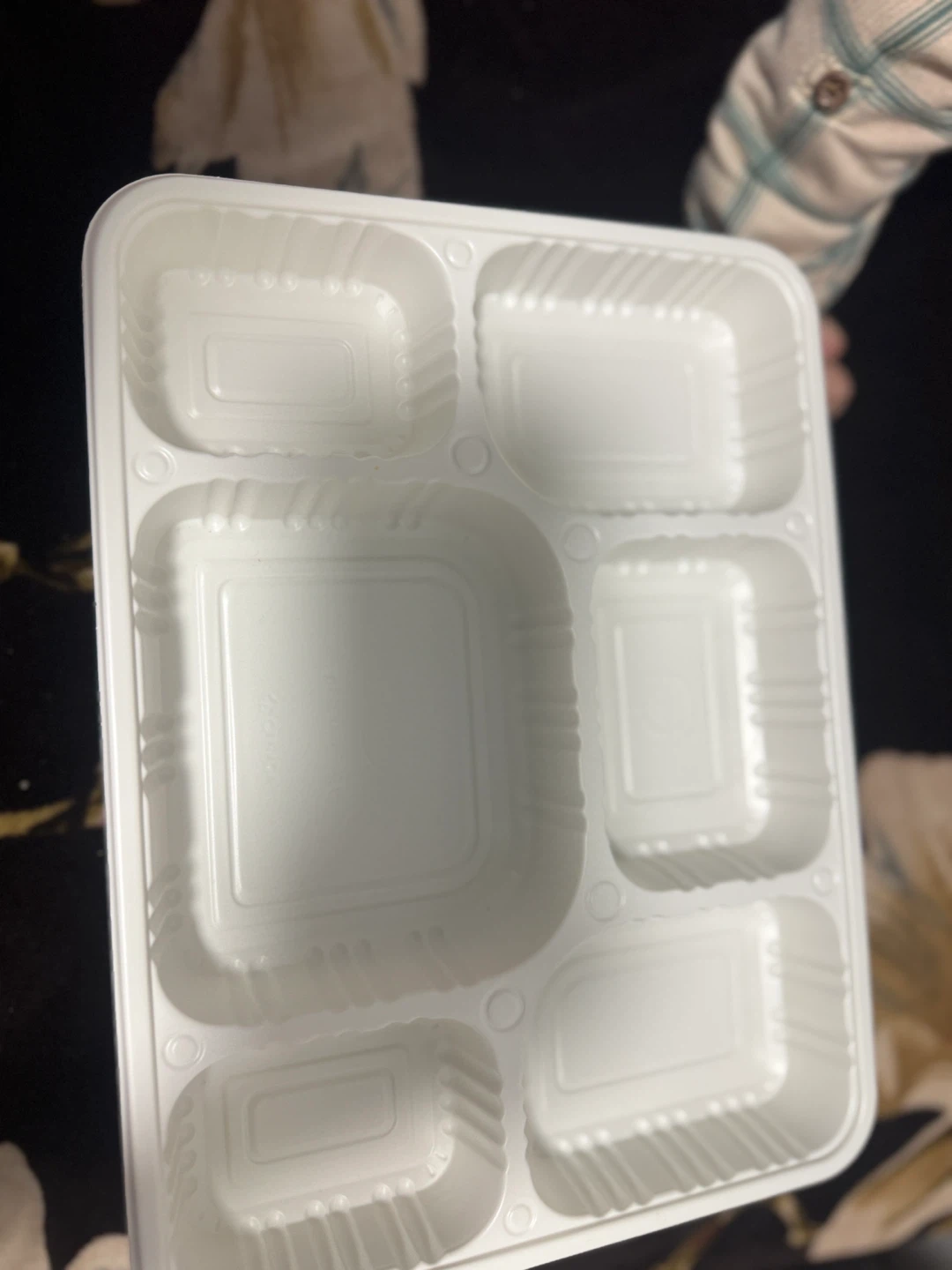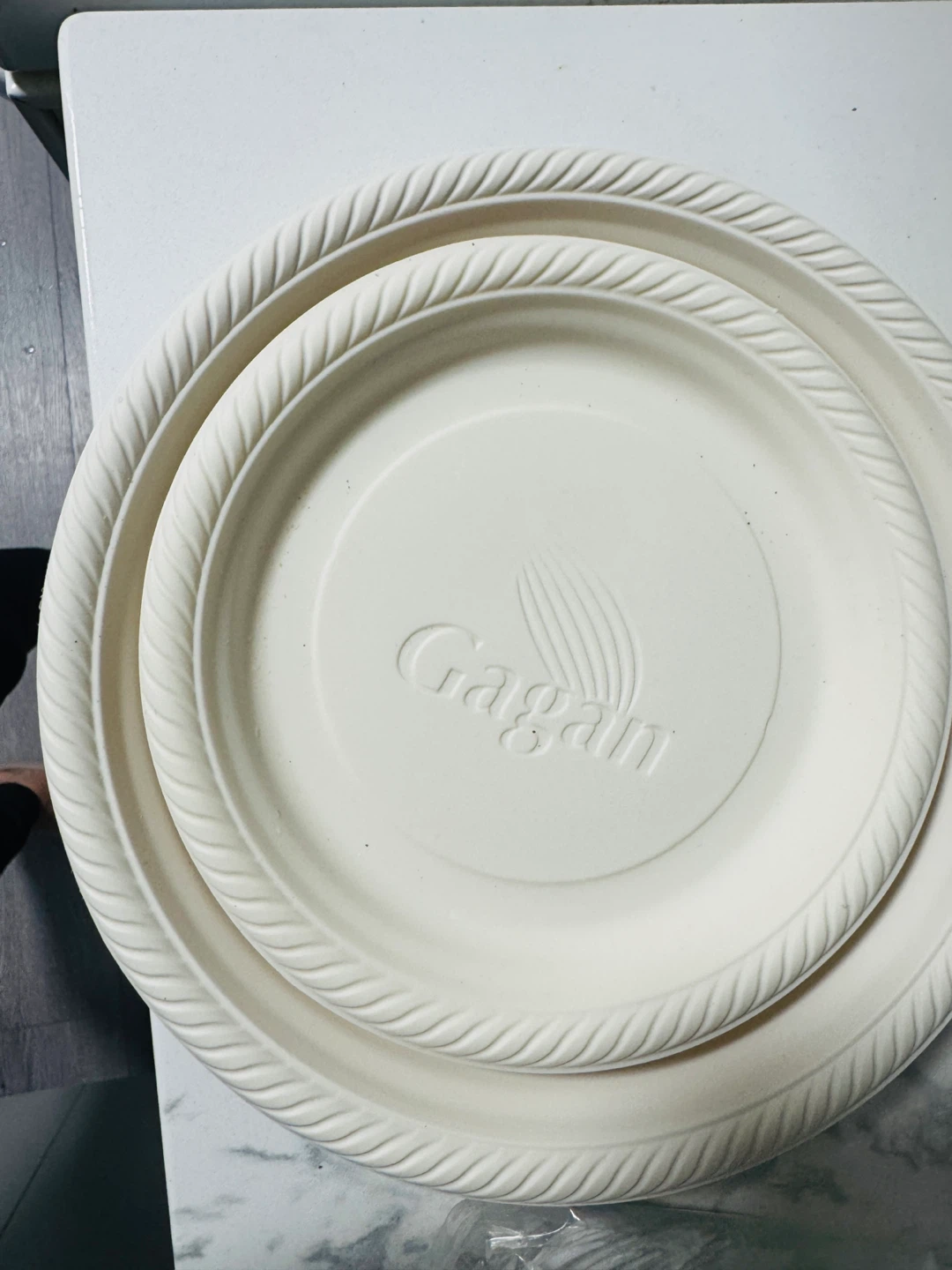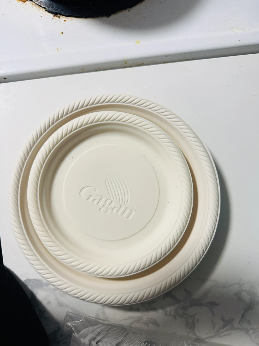 This set includes disposable plates and cutlery. The plates are beige and have a braided rim detail with a debossed logo. Also includes a white divided food tray and a package of white plastic spoons. Perfect for picnics or parties!