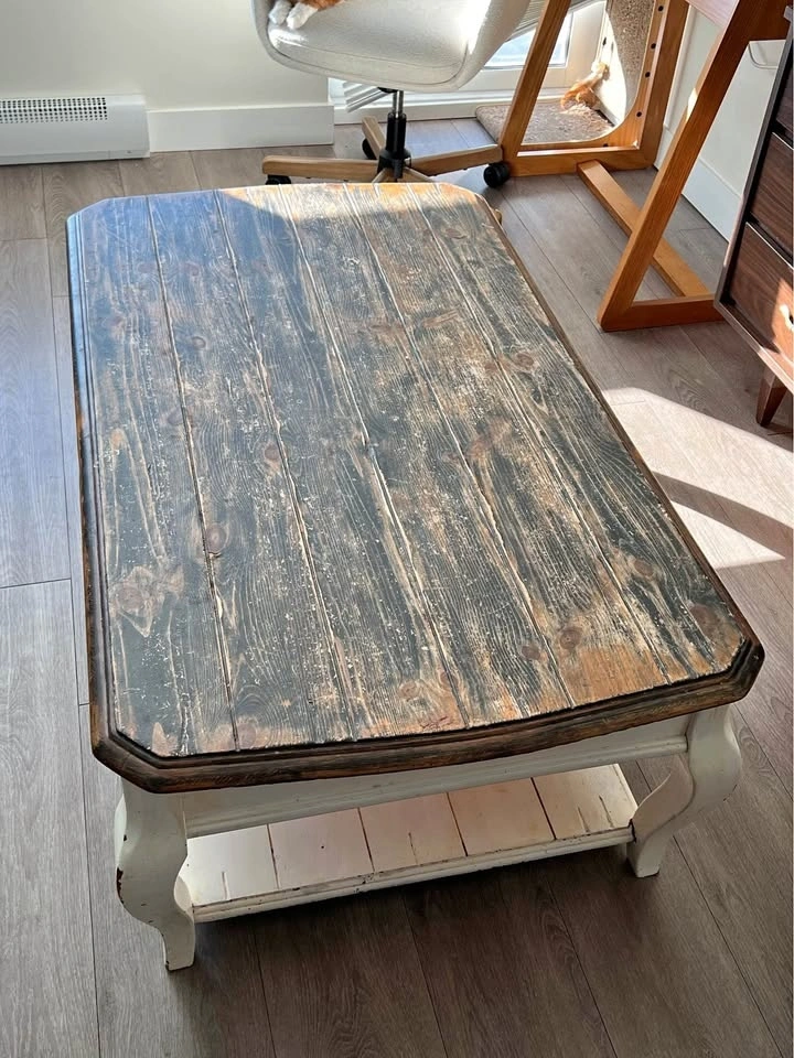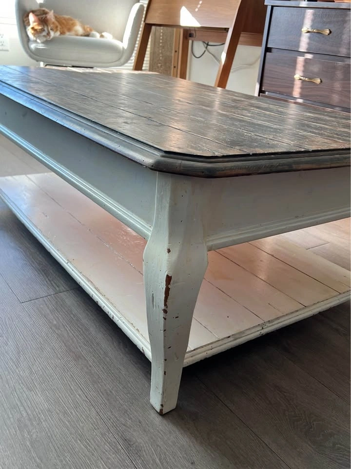 Dimensions: L: 50.5 in, W: 30 in, H: 17.5 in. This is a great coffee table, but it definitely needs repainting. The drawer is decorative and does not open. It's heavy and made of solid wood. Pickup only in Sapperton.