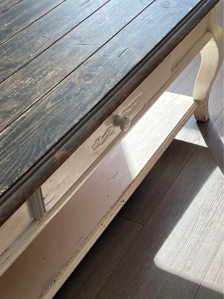 Dimensions: L: 50.5 in, W: 30 in, H: 17.5 in. This is a great coffee table, but it definitely needs repainting. The drawer is decorative and does not open. It's heavy and made of solid wood. Pickup only in Sapperton.