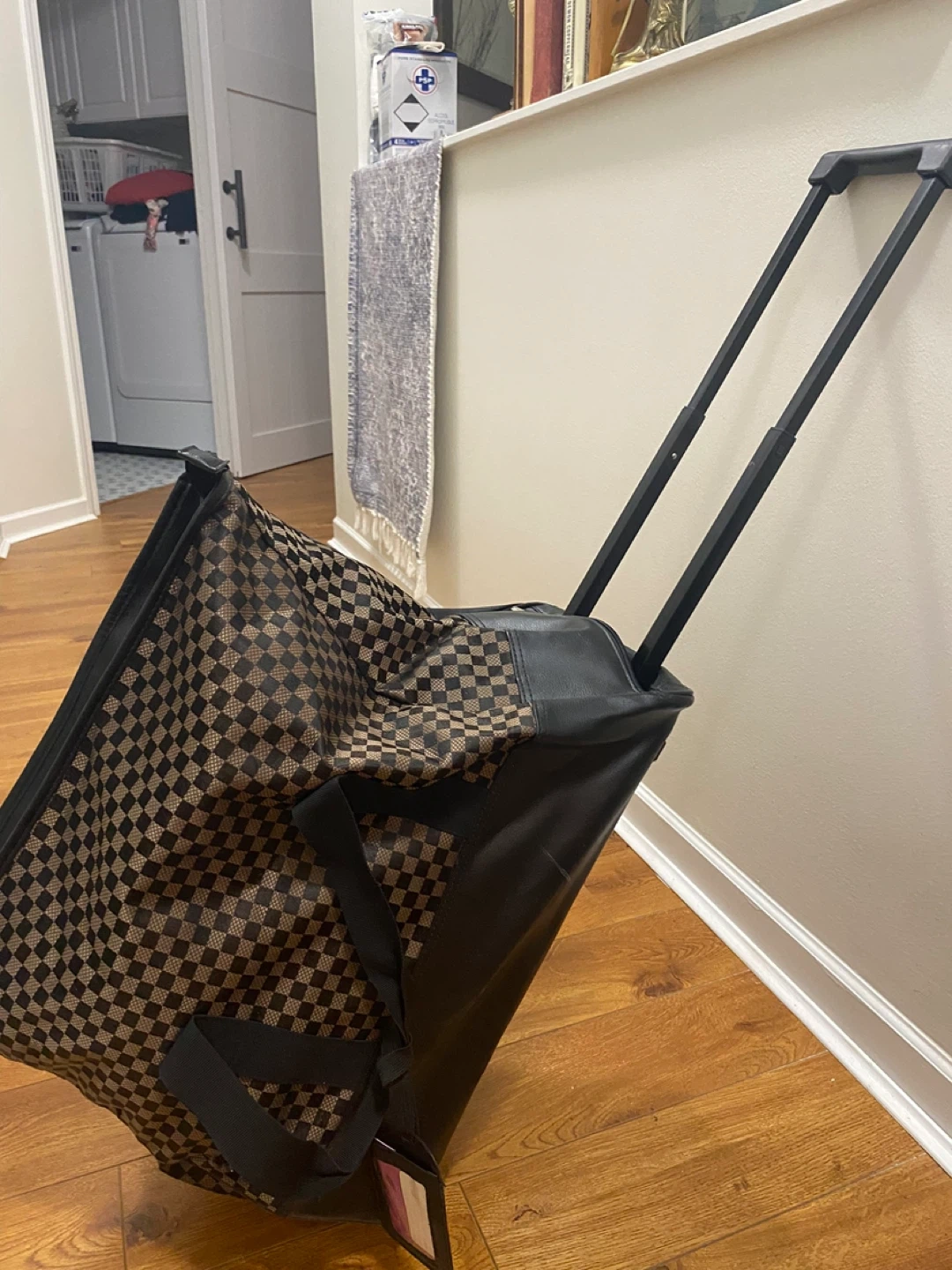 This rolling duffle bag has a classic checkered pattern with black trim. It features a retractable handle and wheels for easy transport. Perfect for weekend trips or travel!
