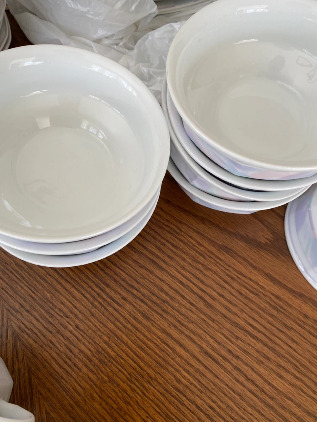 Set of ceramic bowls with a subtle pastel swirl design. These bowls are perfect for serving individual portions of soup, salad, or dessert. They're made from durable ceramic and are dishwasher safe for easy cleanup.