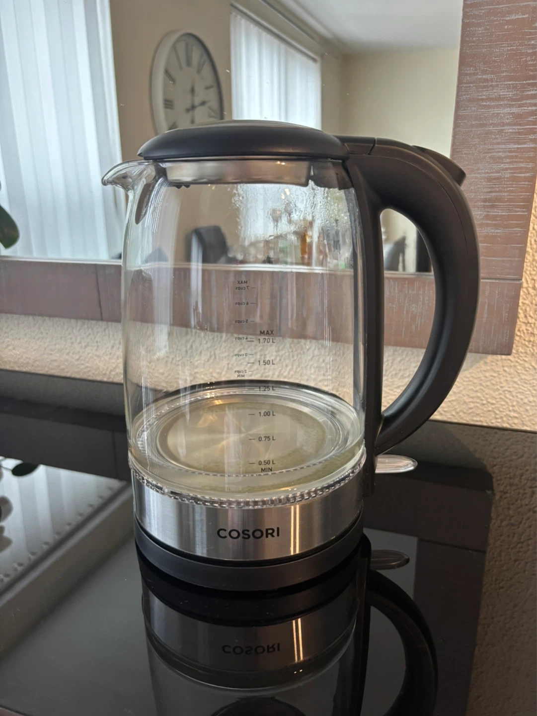 This is a COSORI electric glass kettle. It has a 1.7L maximum capacity. The kettle is made of glass and stainless steel.
