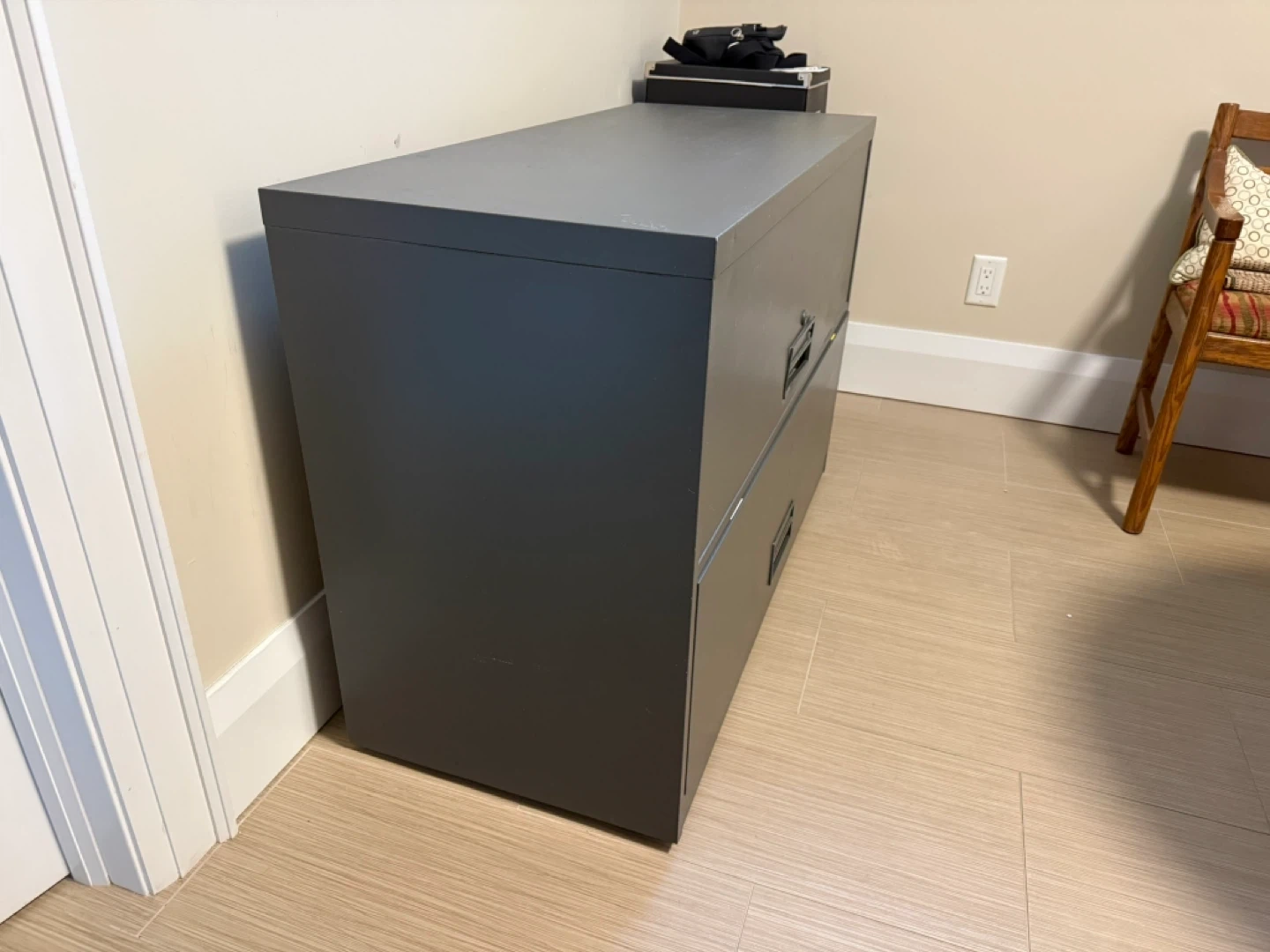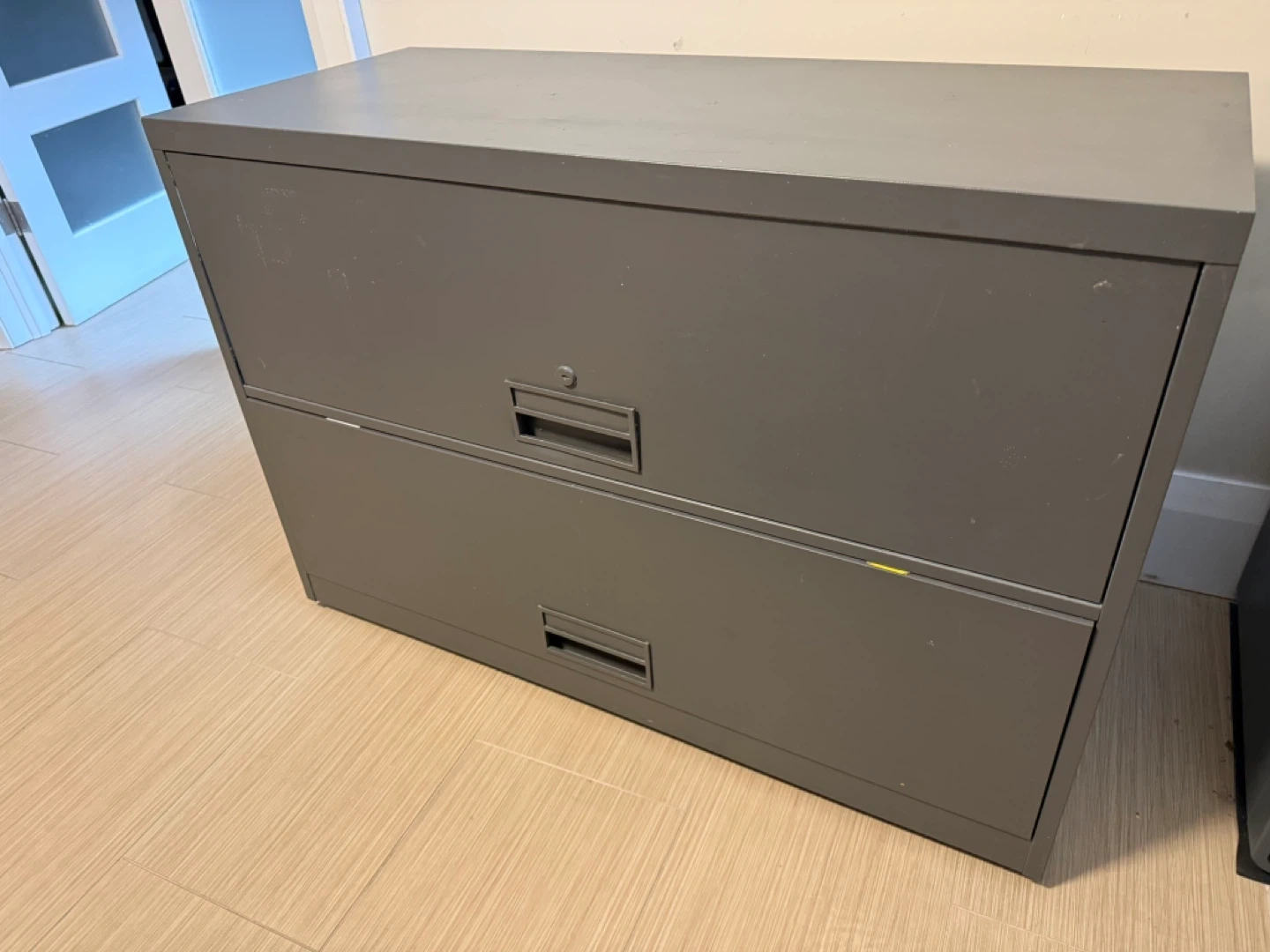 This is a grey, two-drawer metal filing cabinet. It has a lock on the top drawer. It's great for organizing office documents.
