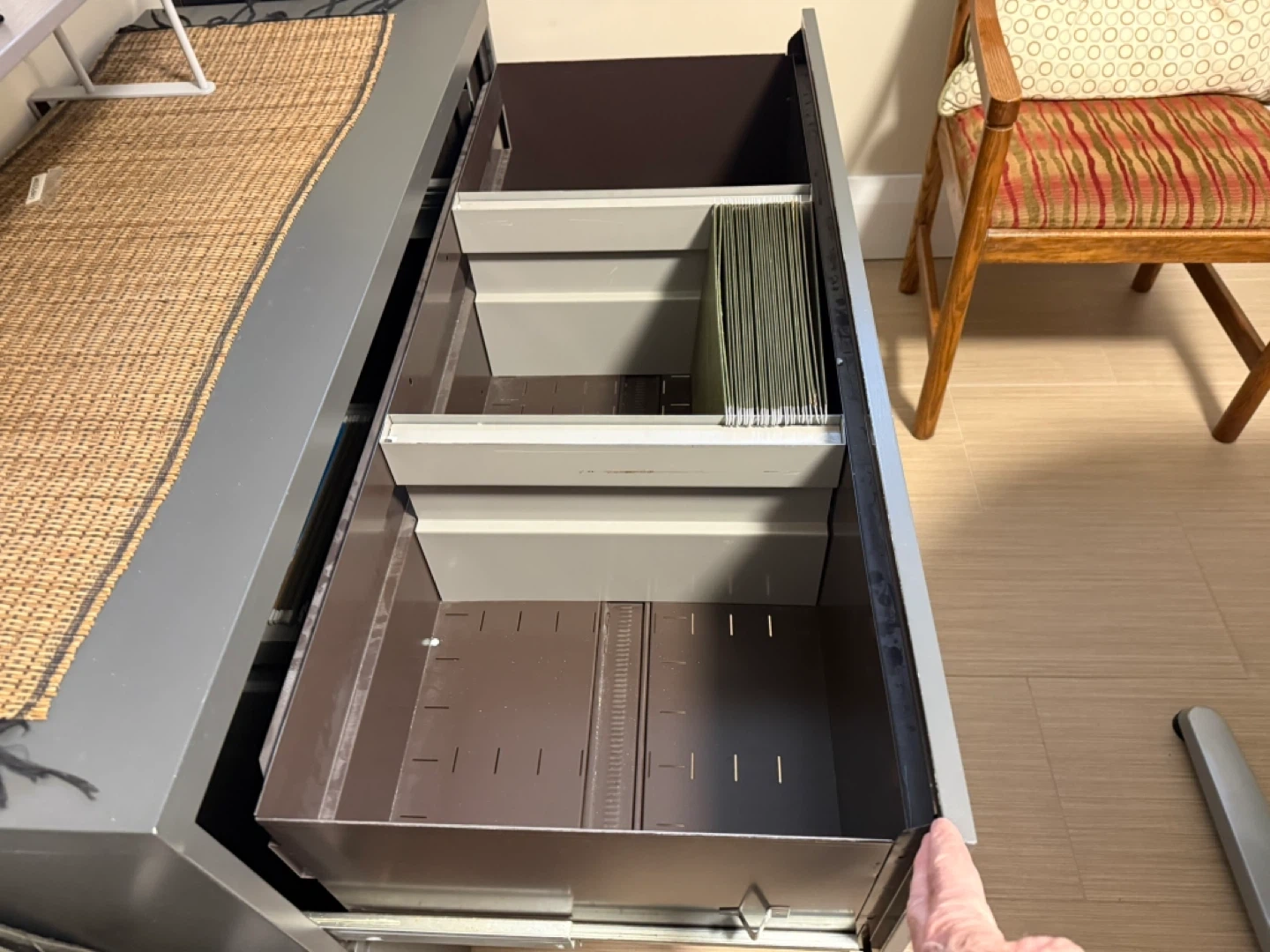 Commercial steel filing cabinet. Fits legal or letter size files and is 42 wide 18 deep and 28 high (inches). We do not have a key for the lock.