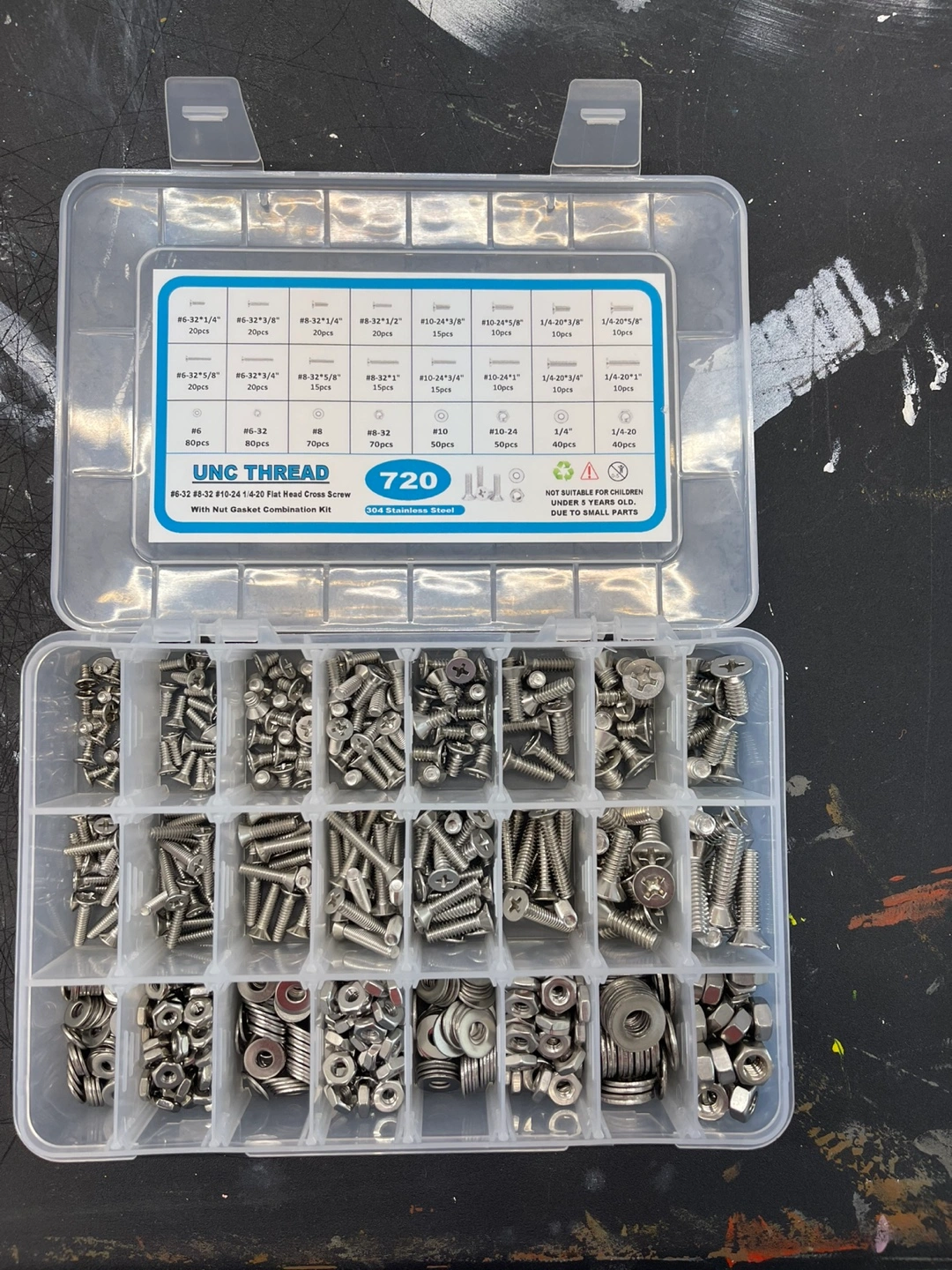 A variety of fasteners are inside, all made from stainless steel. The kit comes with UNC Thread with a nut gasket combination. This could be the perfect set for any project you may have.