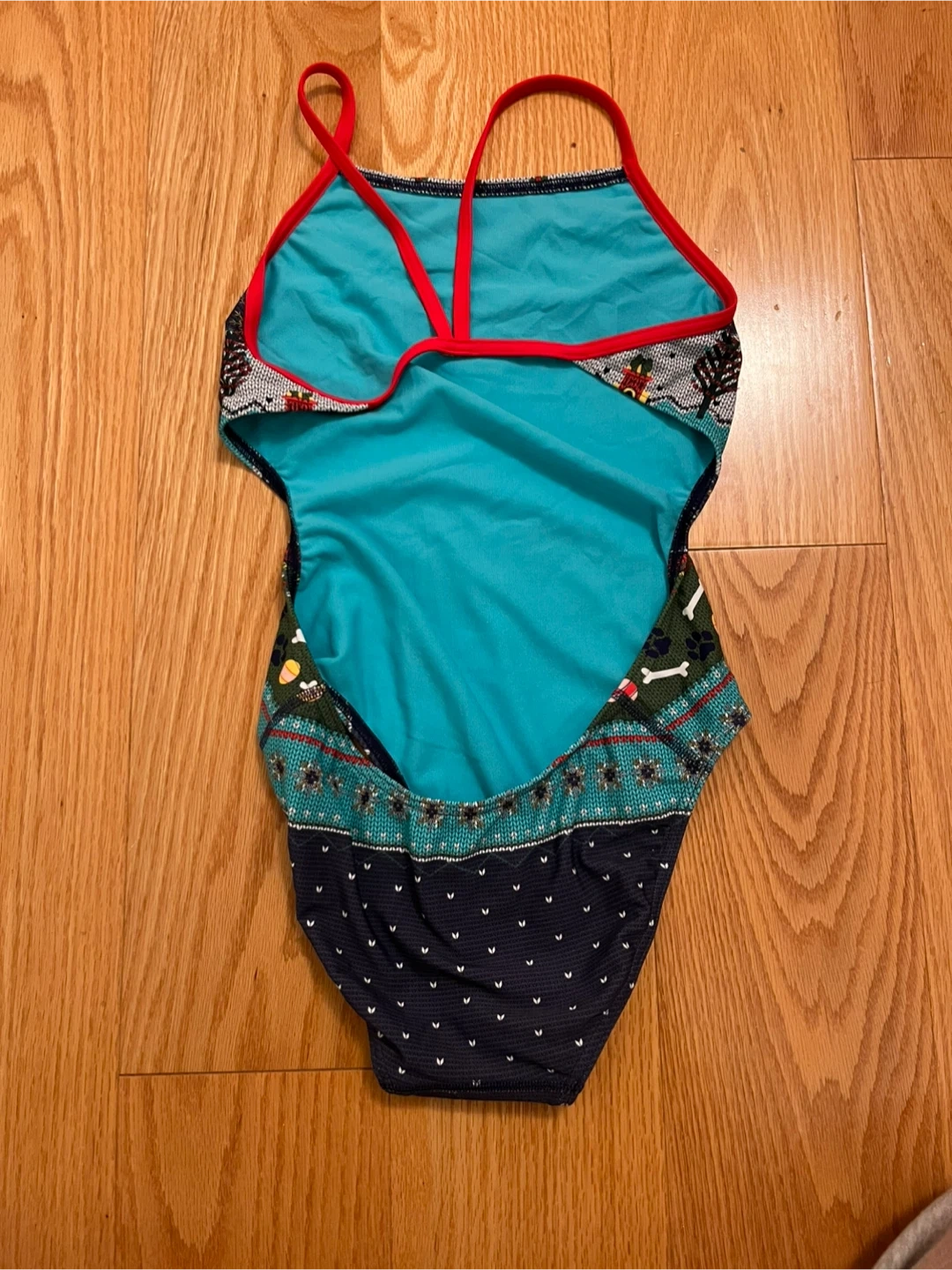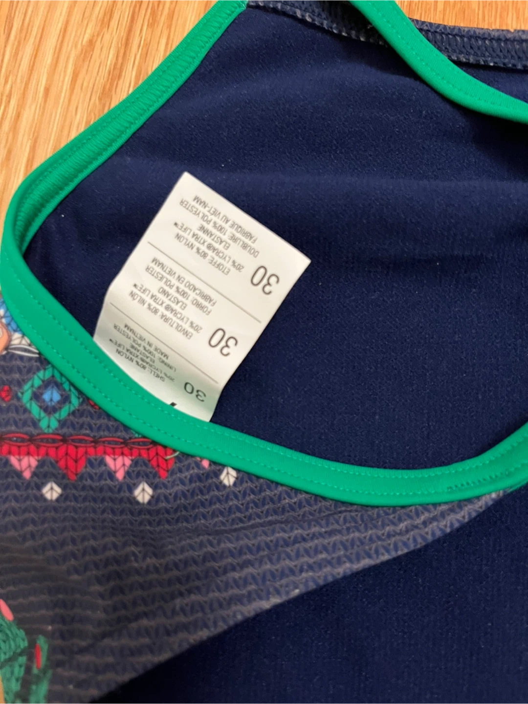 This Sporti swimsuit is size 30. It's made from 80% Nylon and 20% Lycra Elastane. The material is double layered 100% Polyester.