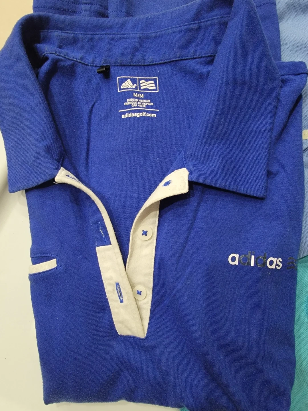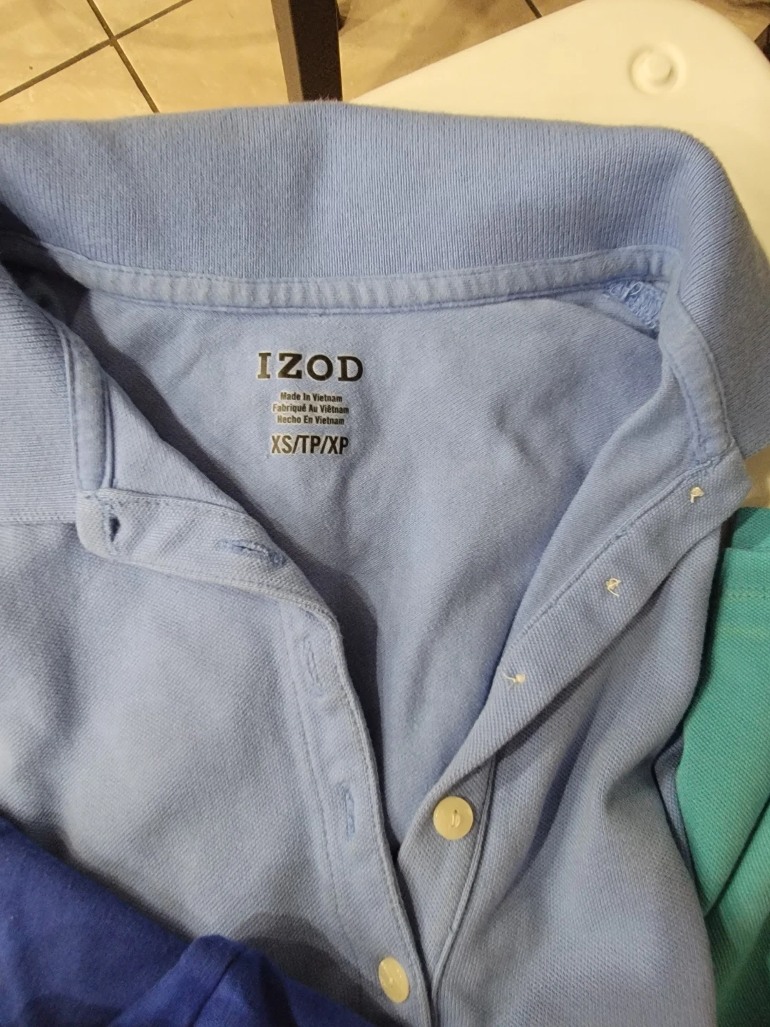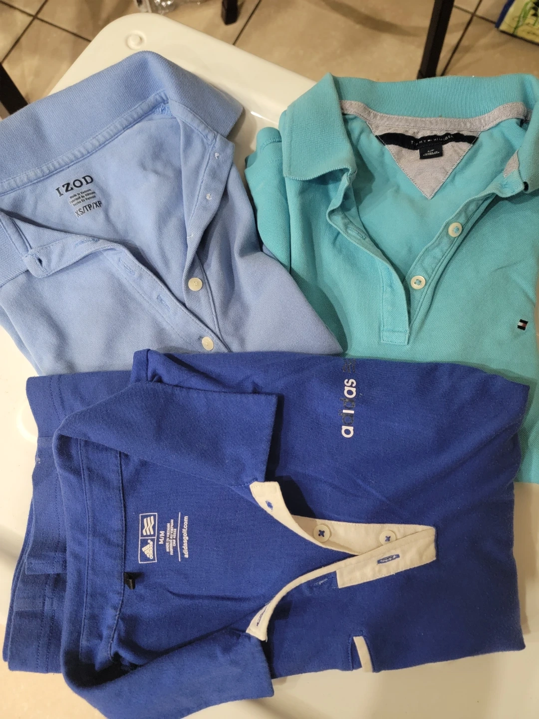 Includes an IZOD polo shirt in XS/TP/XP, a Tommy Hilfiger polo shirt in S/P, and an Adidas Golf polo shirt in M/M. All shirts are collared and made of comfortable fabric.