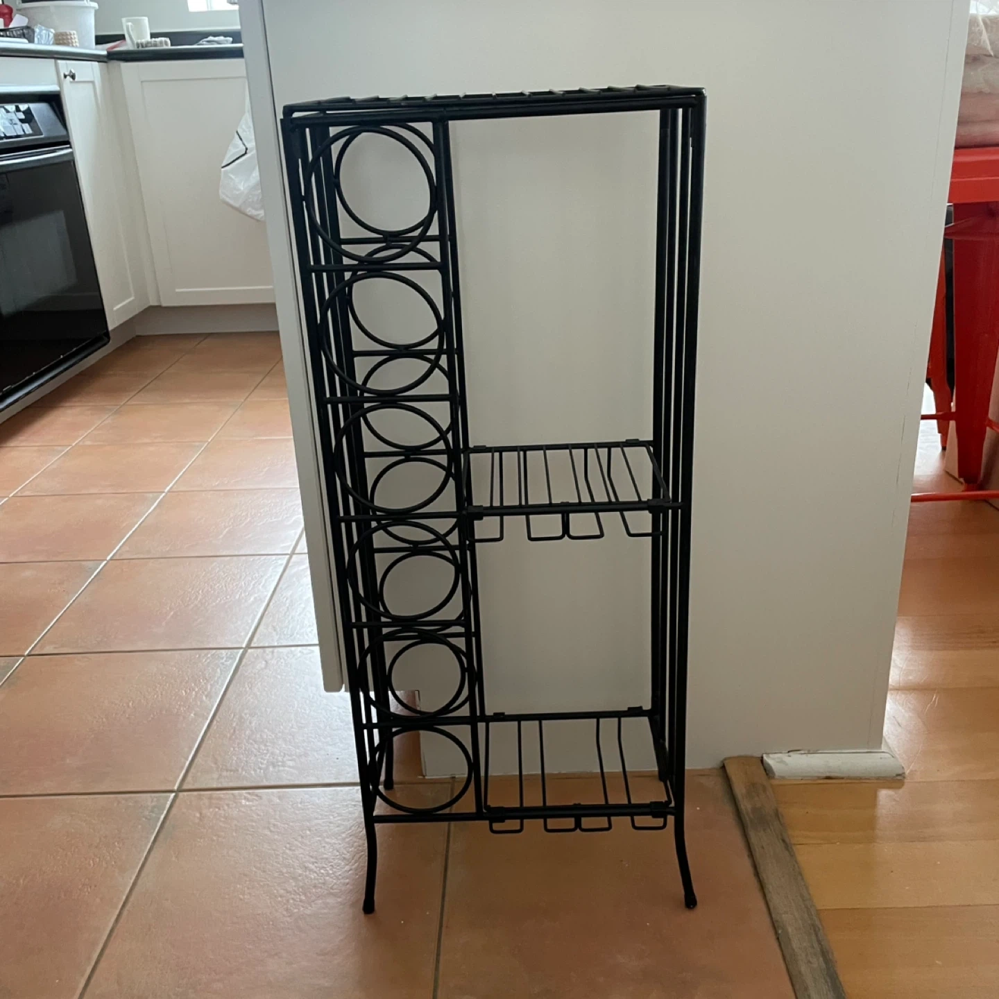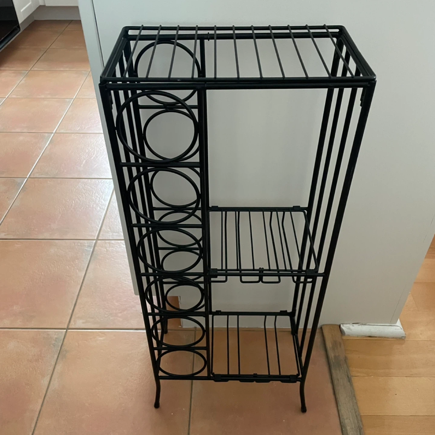 Space for wine bottles pus shelves for other bottles and glasses- wine glass holders. The selves are removable to move around or take off as needed. In perfect condition.