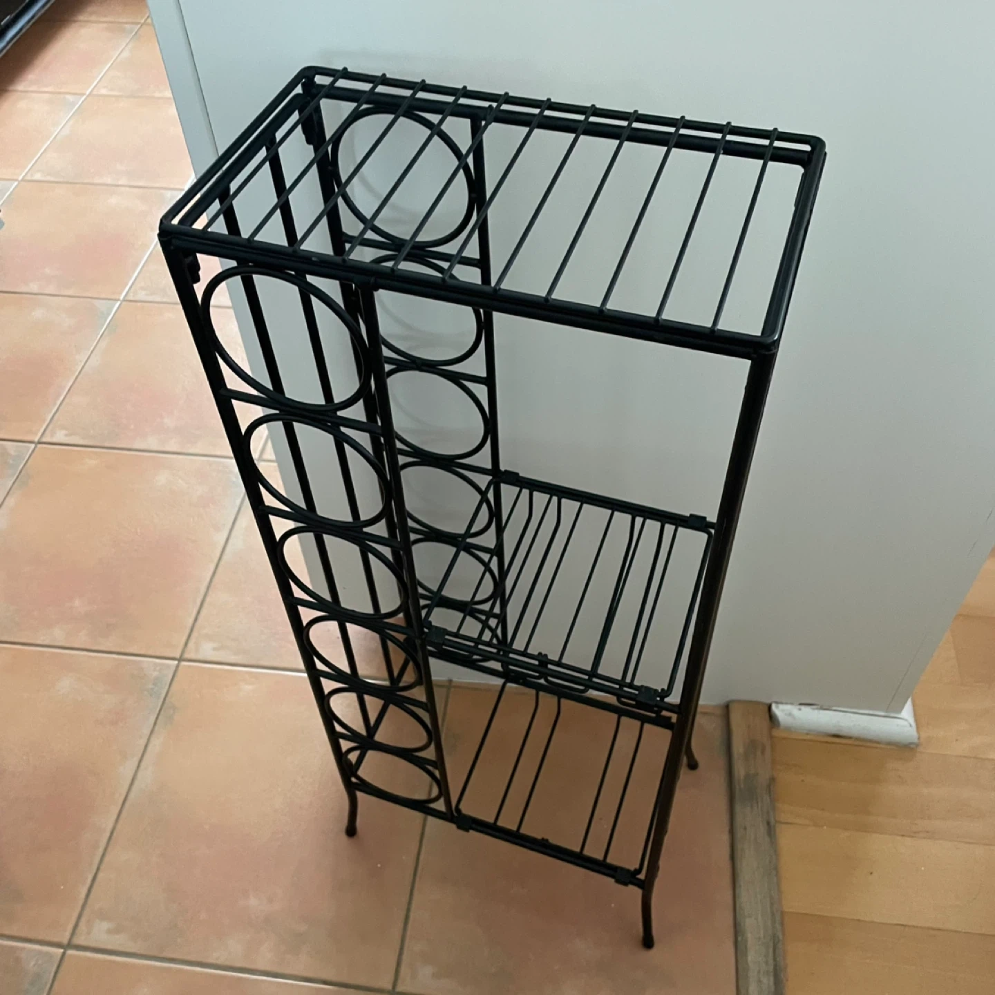 Space for wine bottles pus shelves for other bottles and glasses- wine glass holders. The selves are removable to move around or take off as needed. In perfect condition.