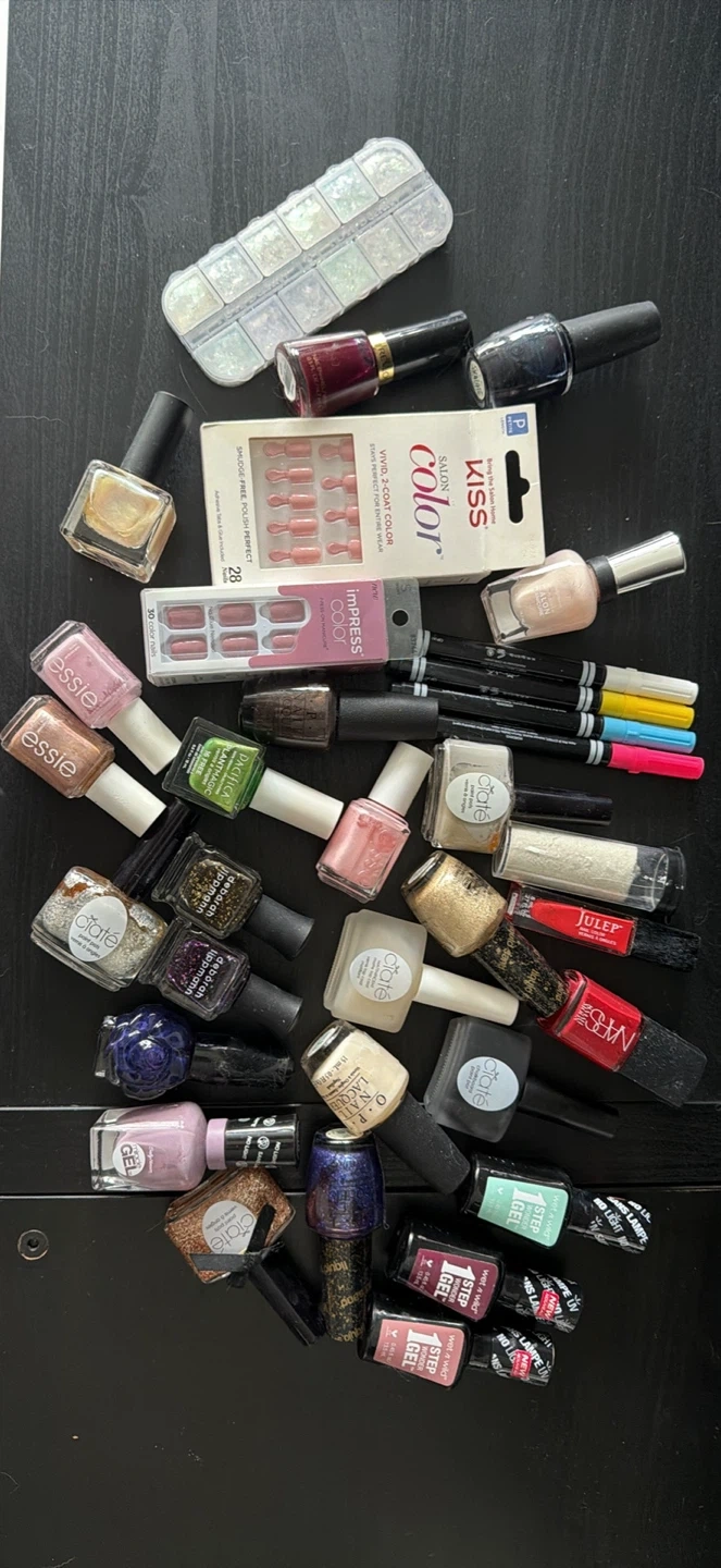 A collection of assorted nail polish bottles from brands like Essie, OPI, Julep, NARS, Ciaté, and Deborah Lippmann. Includes two boxes of Kiss and imPRESS press-on nails, plus a case of nail decorations. A variety of colours and finishes are available.