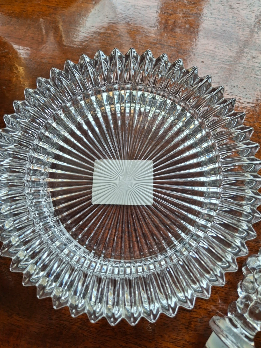 Mikasa Diamond Fire wine set. Includes a ribbed cut wine holder and a grape bottle stopper. Bottle holder still has a sticker (stopper does not). 6” across, 1.25” deep. Stopper is 5.5”.