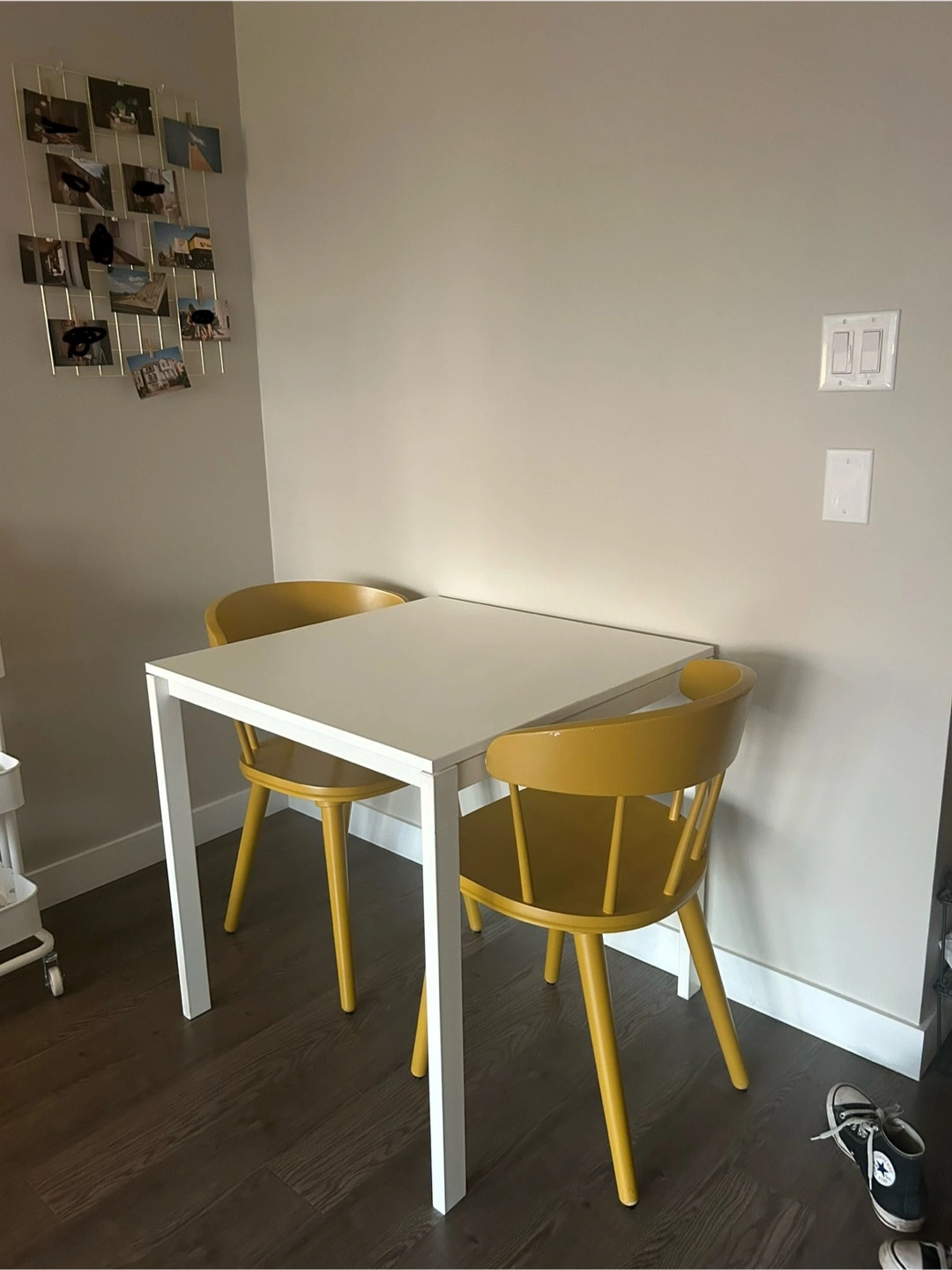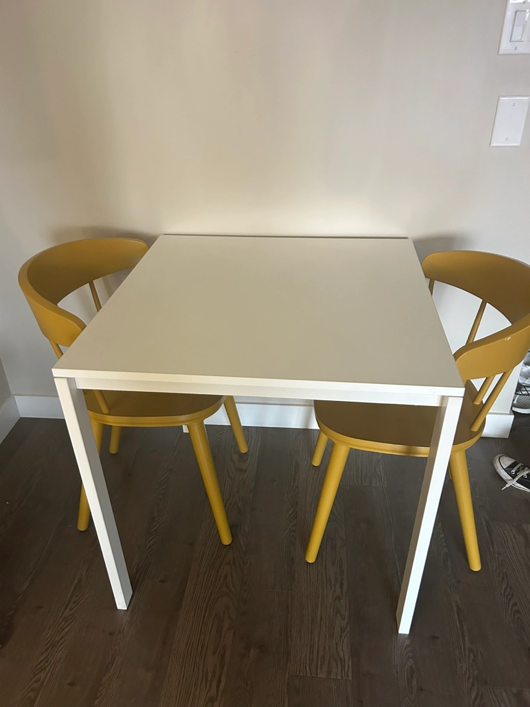73Selling an IKEA table with two chairs! This set is perfect for a small dining area or kitchen nook. I really love this set, it’s great for a small space and brightens up the space. I am selling due to relocation Colour: white table, yellow/mustard chairs (very cute) Small paint chips on chairs but otherwise in great condition Table specs: square (29.5 x 29.5 inches) Pick up: around Marine Dr Skytrain station