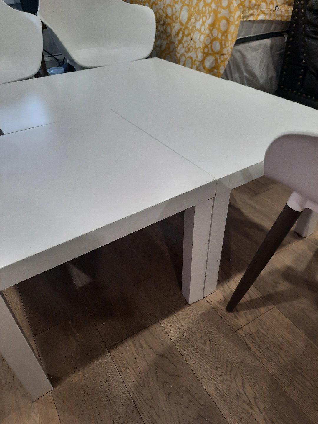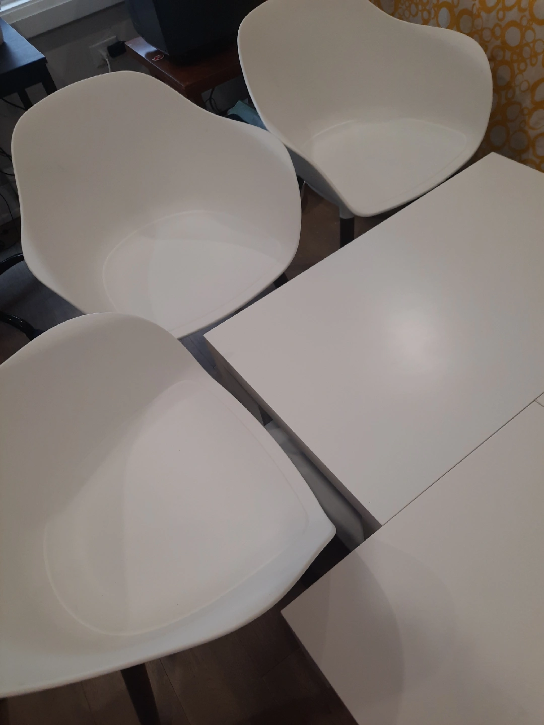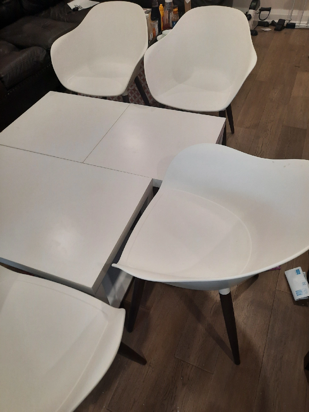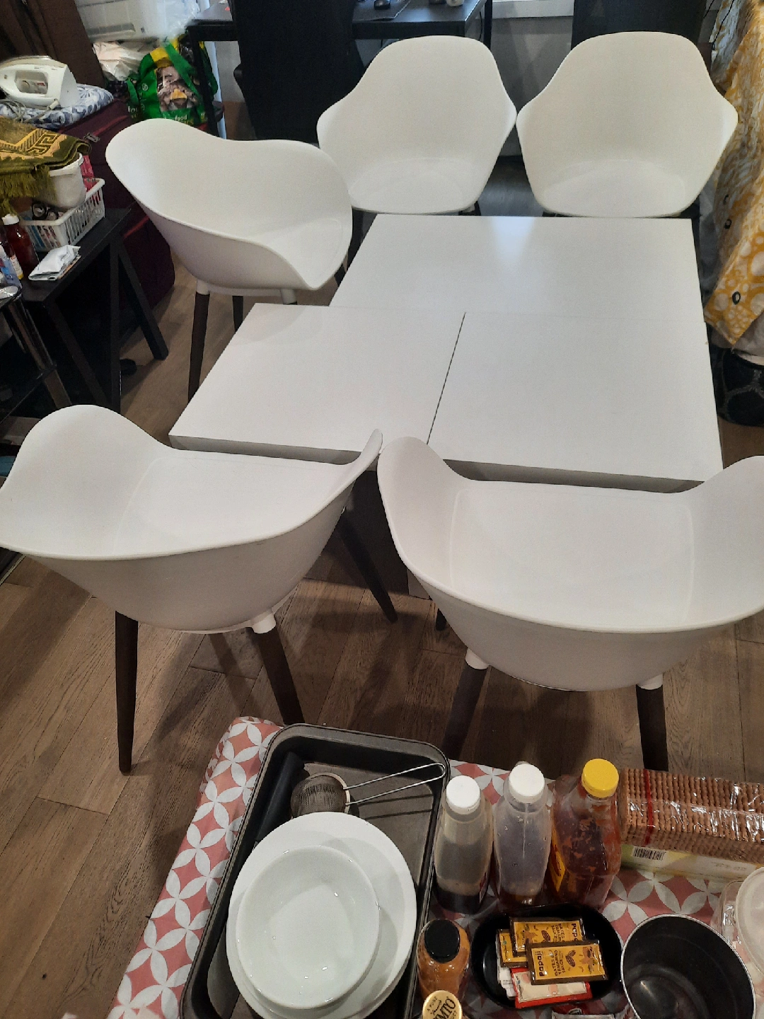 Selling a dining table with four matching chairs. The set is in great condition and would be perfect for a small dining area or kitchen. The chairs have a unique, modern design and are very comfortable. The table is a clean, simple white that will match any decor. A great set for any home! 5 chairs and 3 tables of IKEA for sale for only $350 ,chairs legs are detachable for more info text or call tariq 4167865010