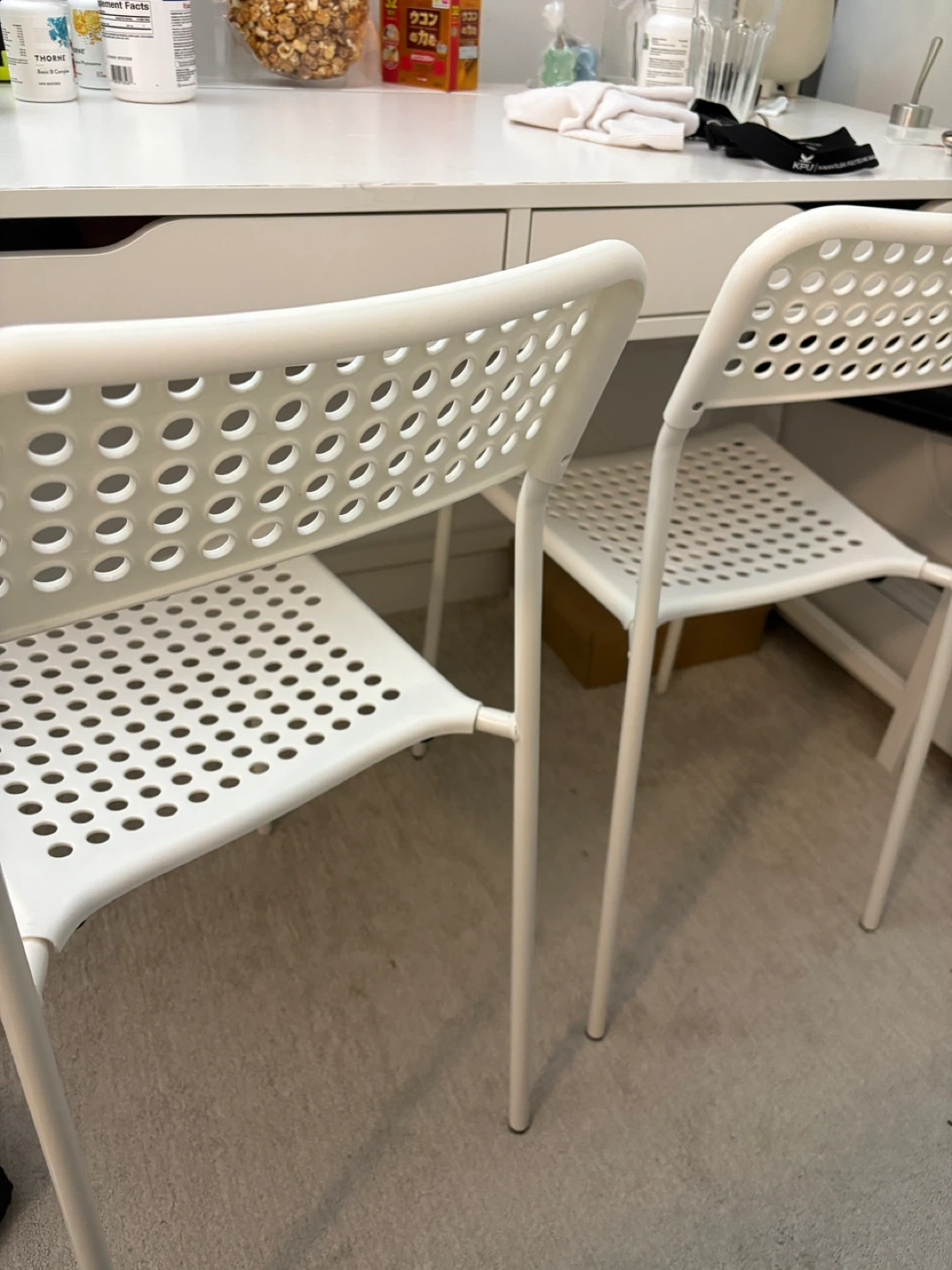 Selling an IKEA Alex desk in great condition! The dimensions are 100x48 cm. It's a simple and functional desk that fits well in any room. Perfect for studying or working from home! The original price was CA$179.00 I am selling this only $30 desk+ 2chair