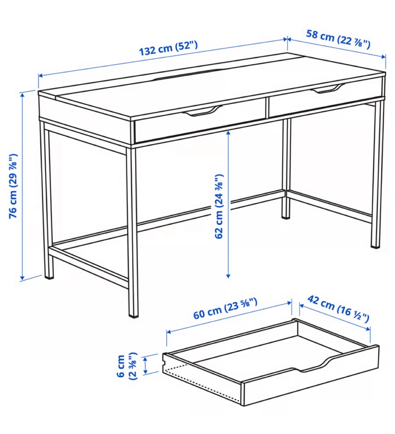 Selling a simple blue desk. It's in great shape and ready for a new home! The desk features two drawers for storage. The ikea Alex desk link: https://www.ikea.com/ca/en/p/alex-desk-white-80483438/?utm_source=google&utm_medium=organic-shopping&utm_campaign=shopping_feed&utm_content=free_google_shopping_clicks_Workspaces&gad_source=1&gad_campaignid=15835029720&gbraid=0AAAAACqC6EqTI3s6myt9xRrX8n47Cw4B8&gclid=EAIaIQobChMI58W3_uqHjwMVTzStBh0dgTHdEAQYAiABEgJvLPD_BwE Dimensions: - Width: 132 cm (52") - Depth: 58 cm (22 ⅞") - Height: 76 cm (29 ⅞")