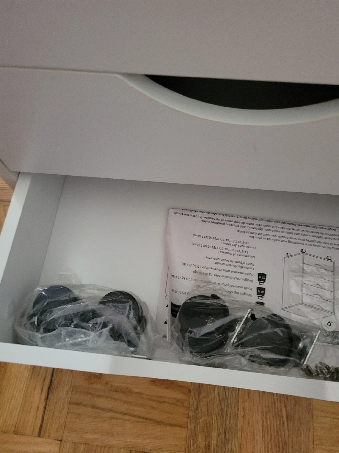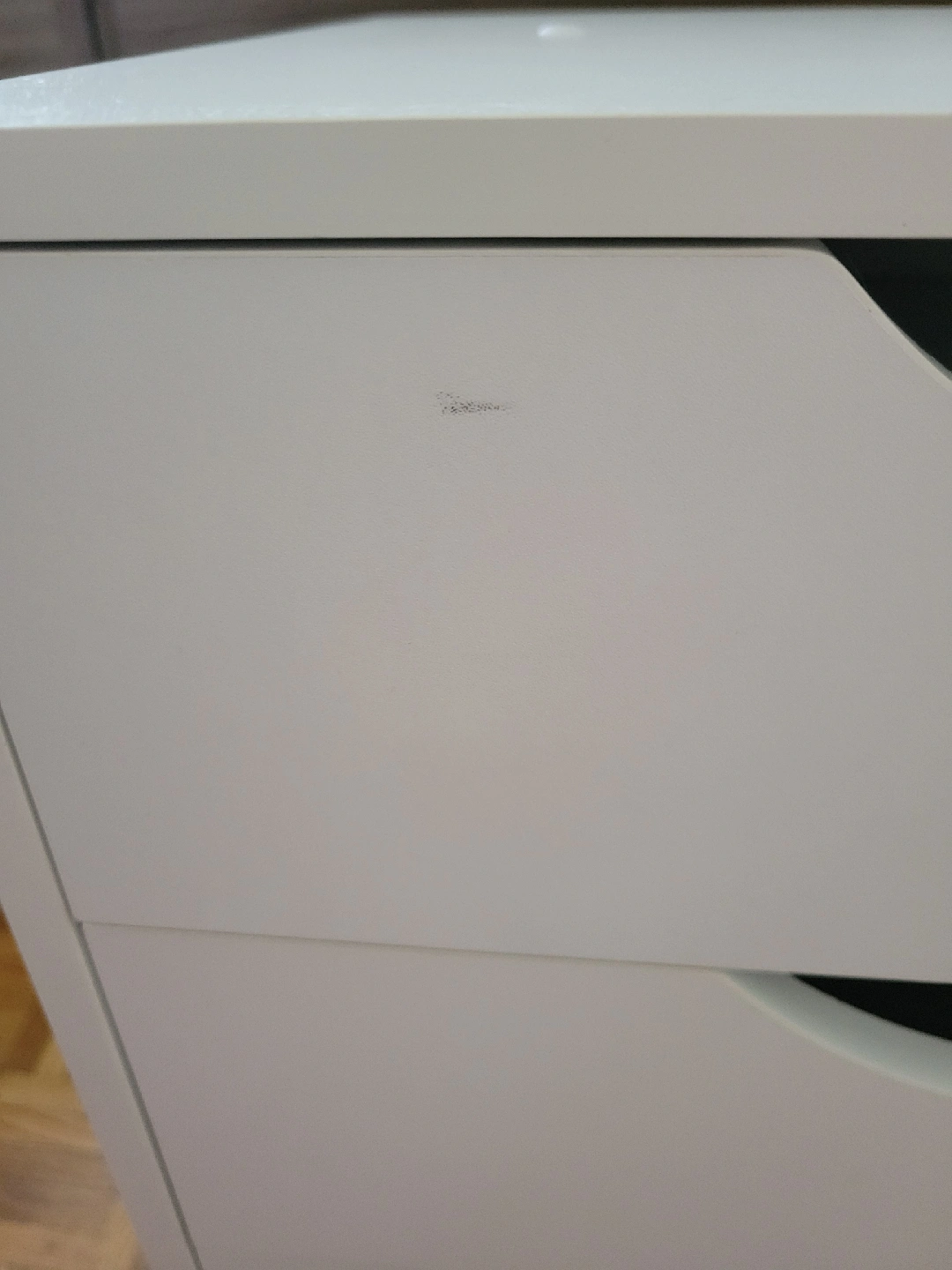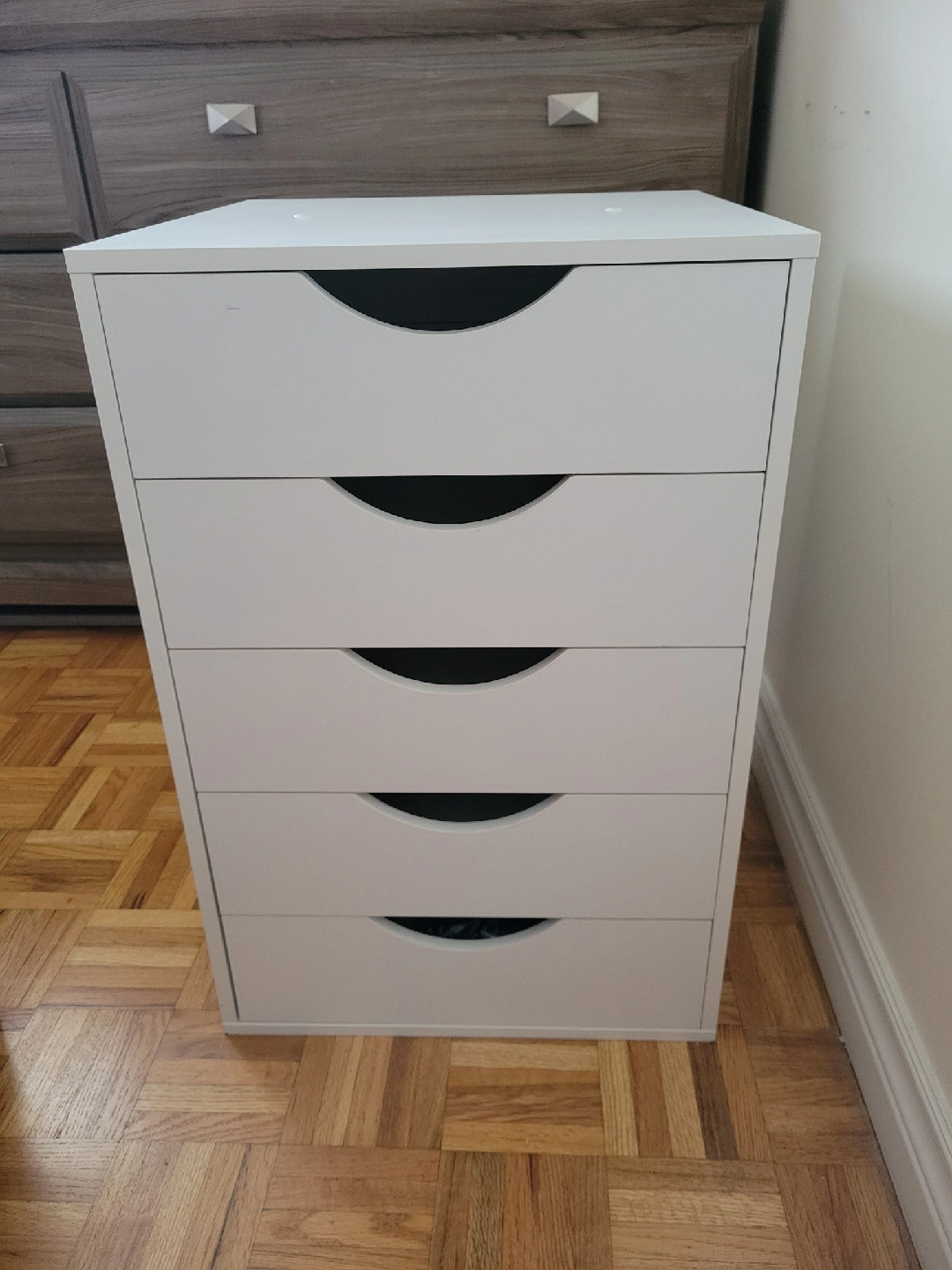 Selling a white IKEA Alex drawer unit. It has five drawers, perfect for storing makeup, crafts, or office supplies. It's in good condition, though there's a small scratch on the front of one of the drawers (see photo). Comes with wheels!