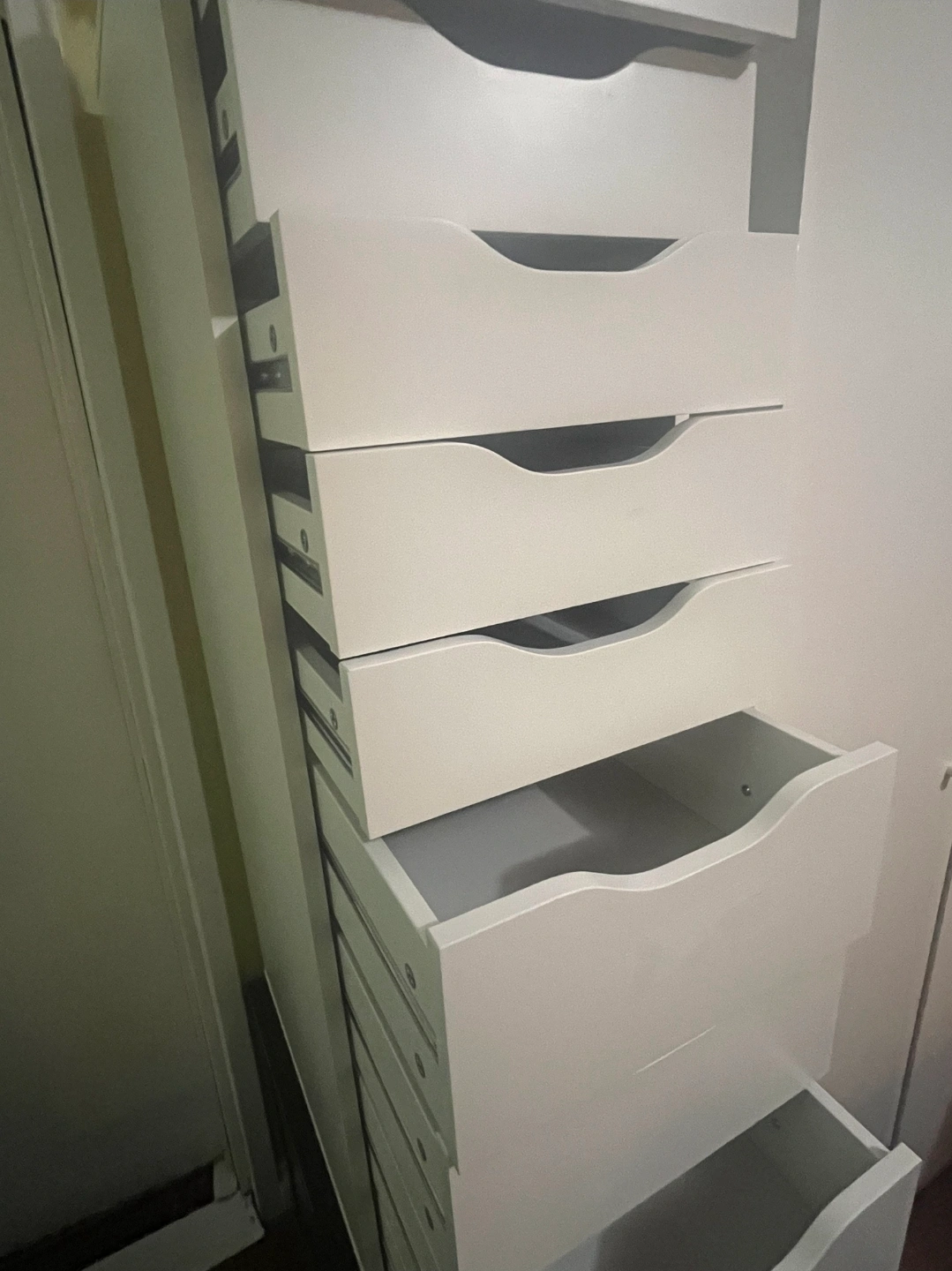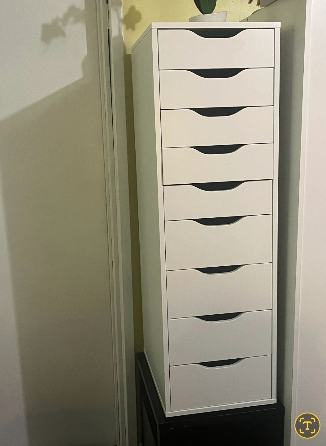 Selling a white IKEA Alex drawer unit. It's in great shape and perfect for organizing your space. This unit features nine drawers, offering plenty of storage. A great addition to any home office or craft room!