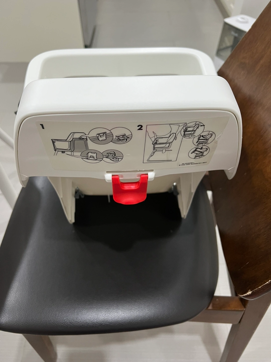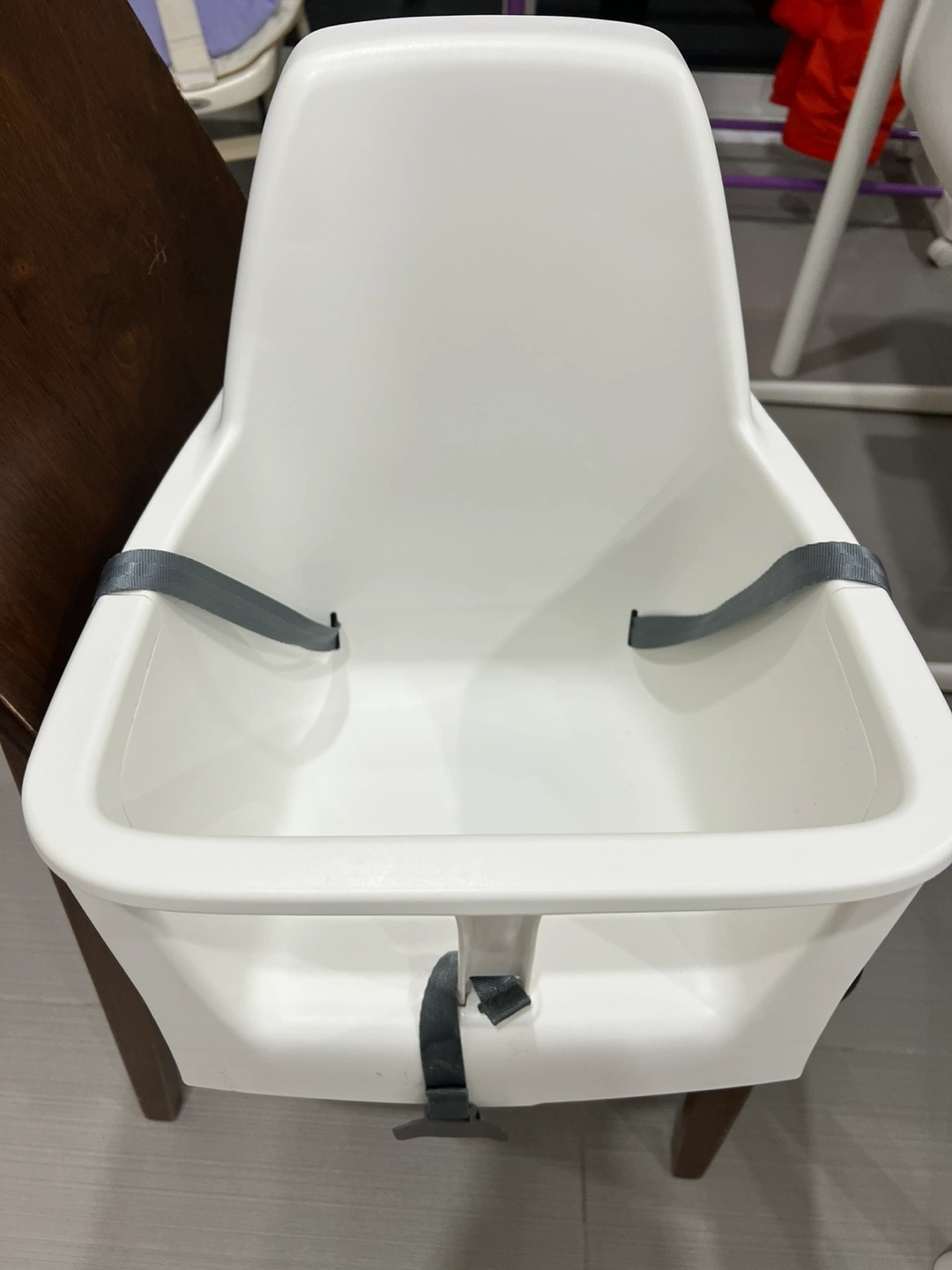35White plastic booster seat. Attaches to most chairs. Includes straps. Easy to clean. Great for toddlers.