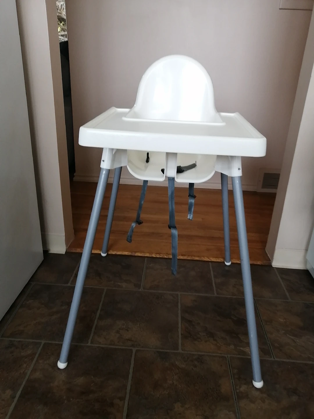 Selling a used IKEA Antilop high chair in white. It's super easy to clean and perfect for little ones starting to eat solids. A great, sturdy chair for your baby!