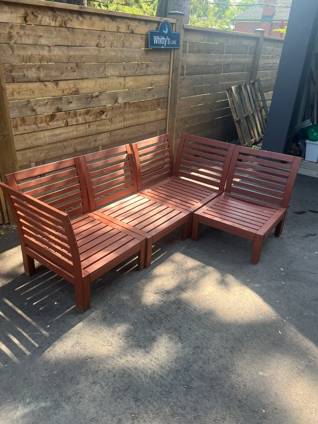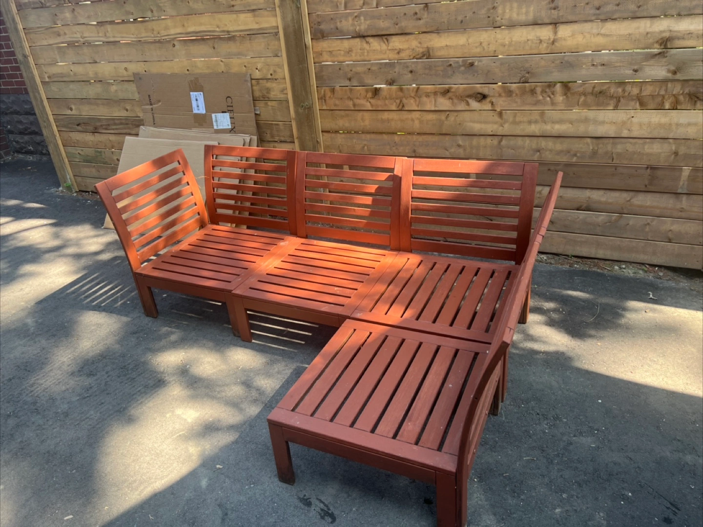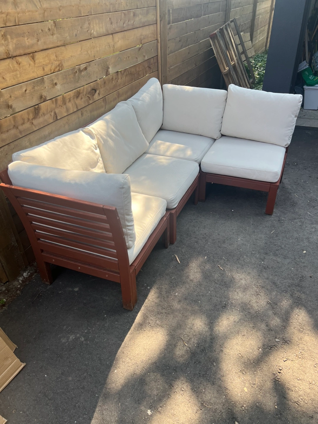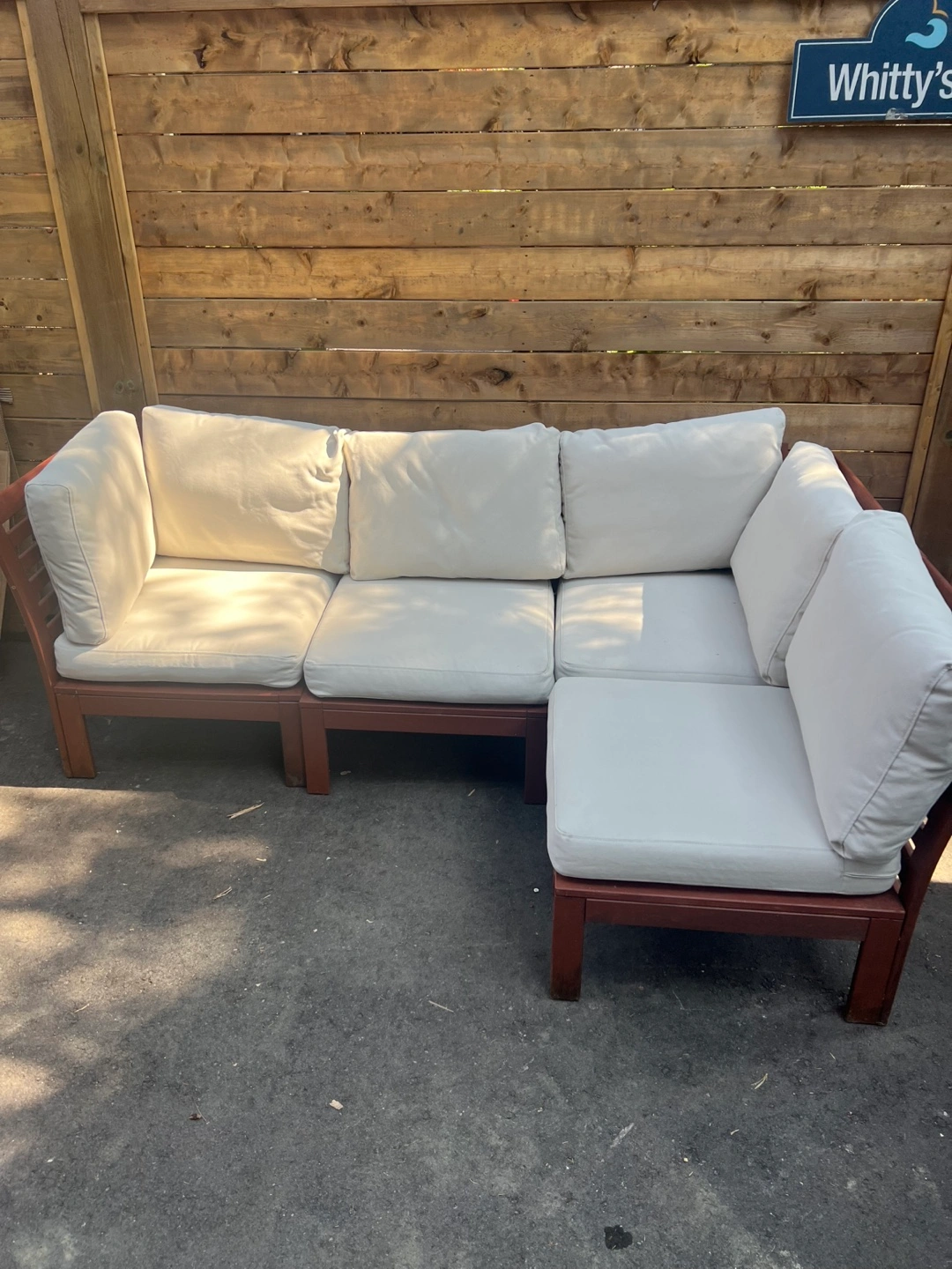 Outdoor sectional sofa with a wooden frame and white cushions There are some stains on the cushions, as shown in the pictures, but otherwise in good condition! Great for relaxing outside on a sunny day