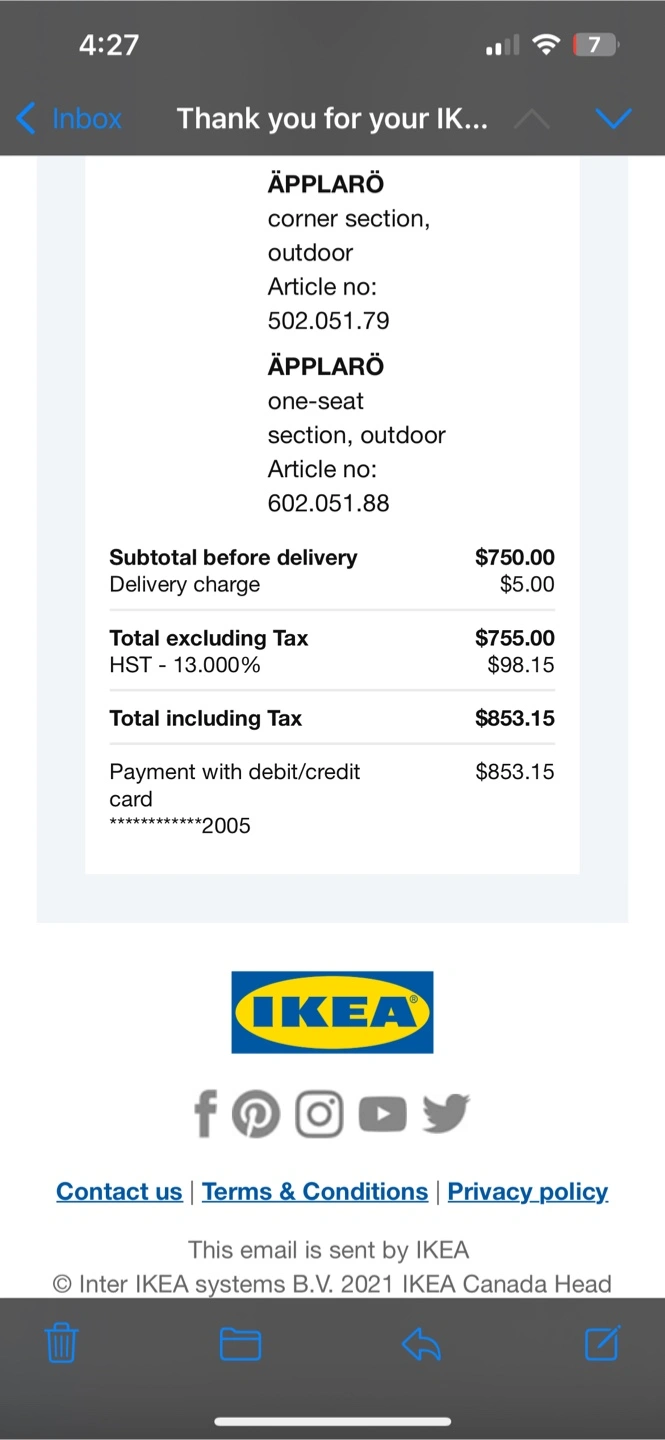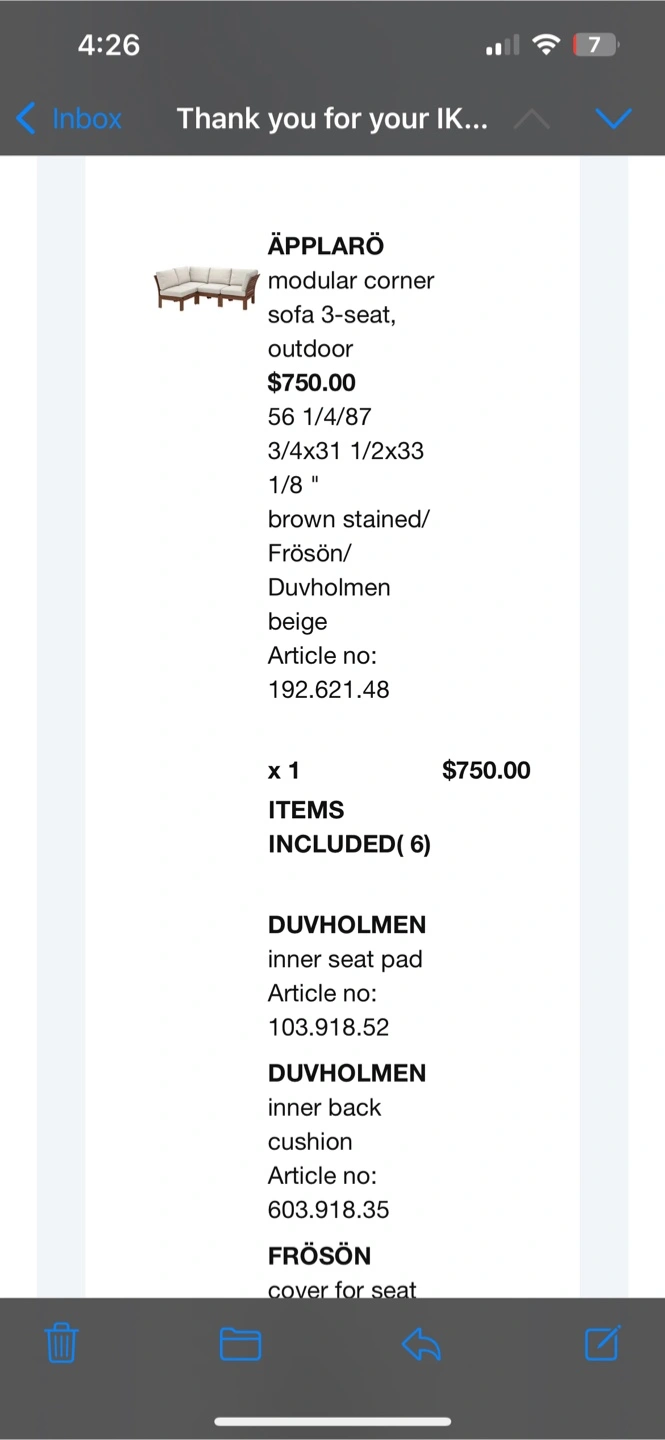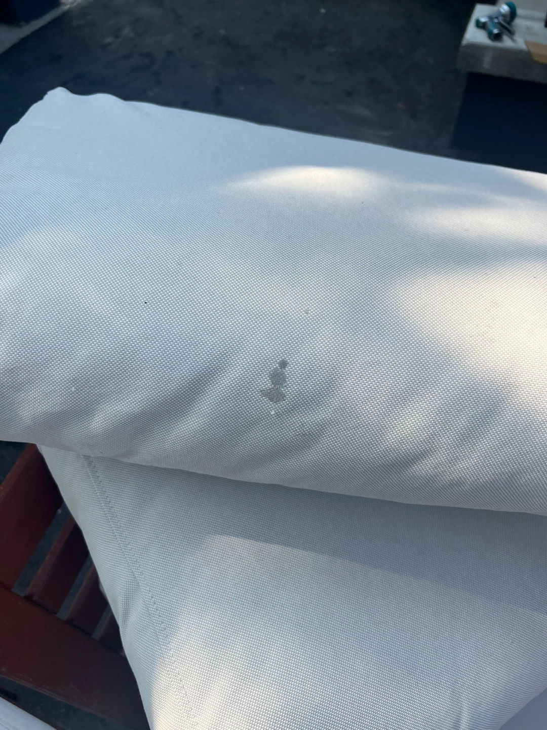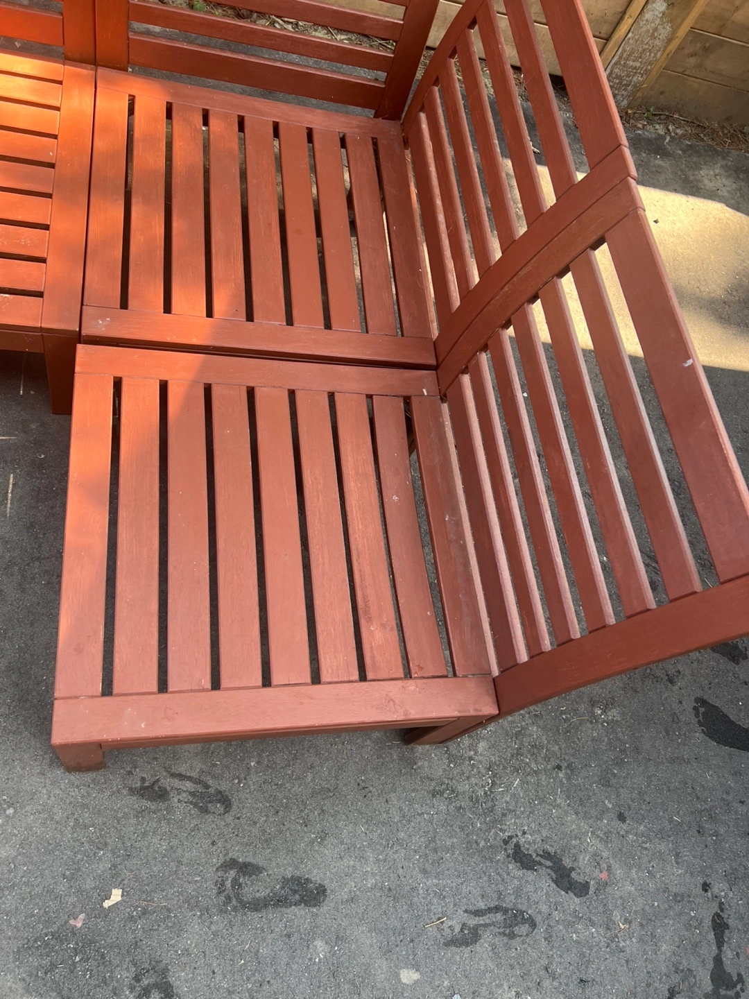 Outdoor sectional sofa with a wooden frame and white cushions There are some stains on the cushions, as shown in the pictures, but otherwise in good condition! Great for relaxing outside on a sunny day