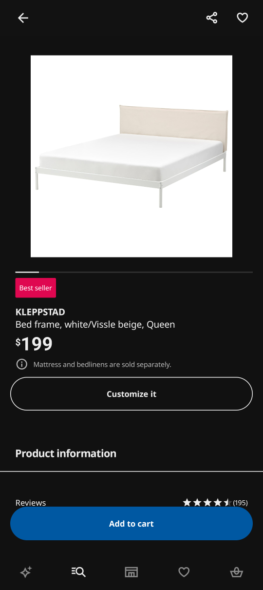 Bought this bed frame in Ikea for our guest room which is barely used. Moving to smaller place that's why I am selling it. Bought it last September 2023 for 199+tax. Very easy to assemble pick up only. o