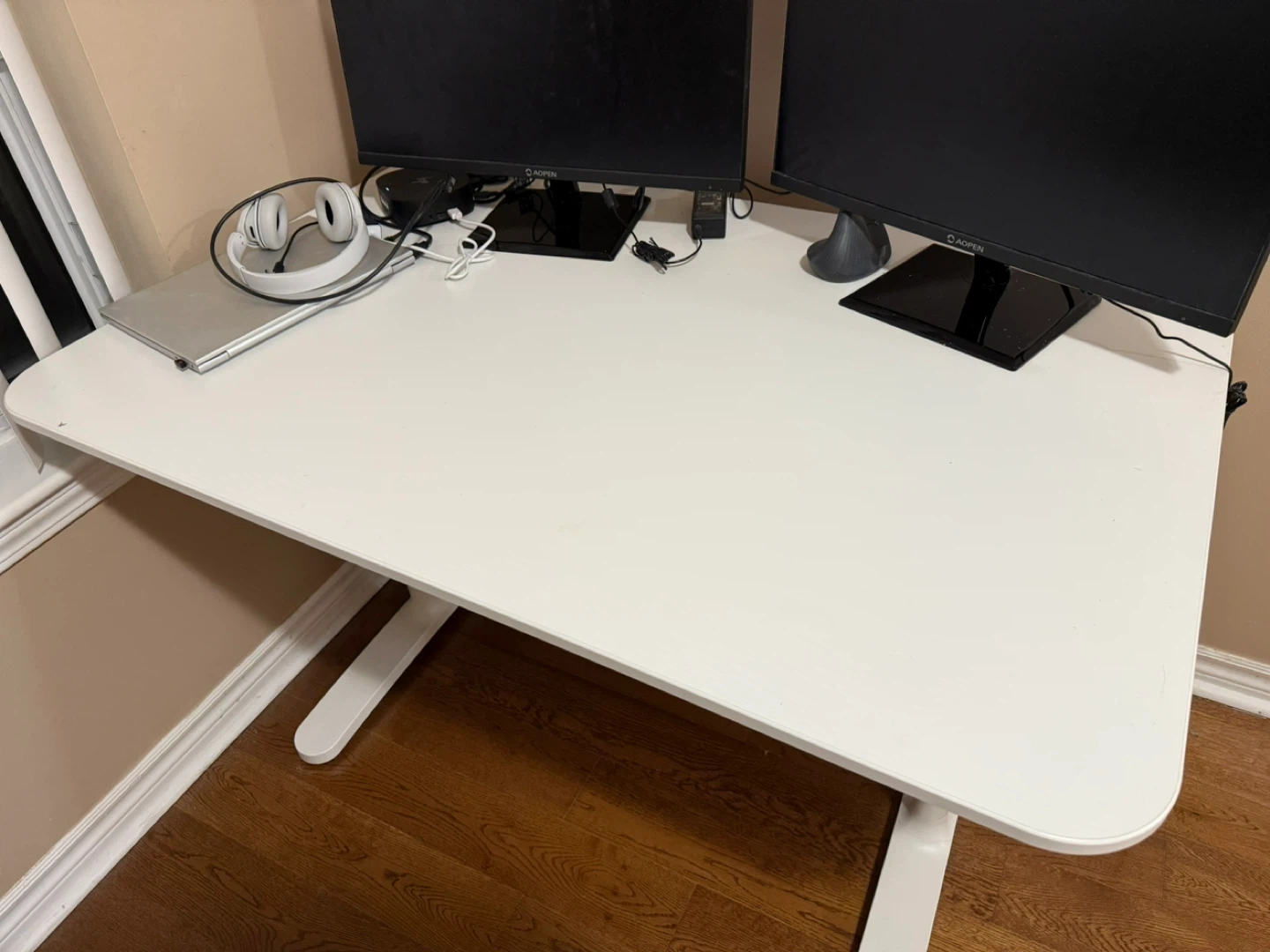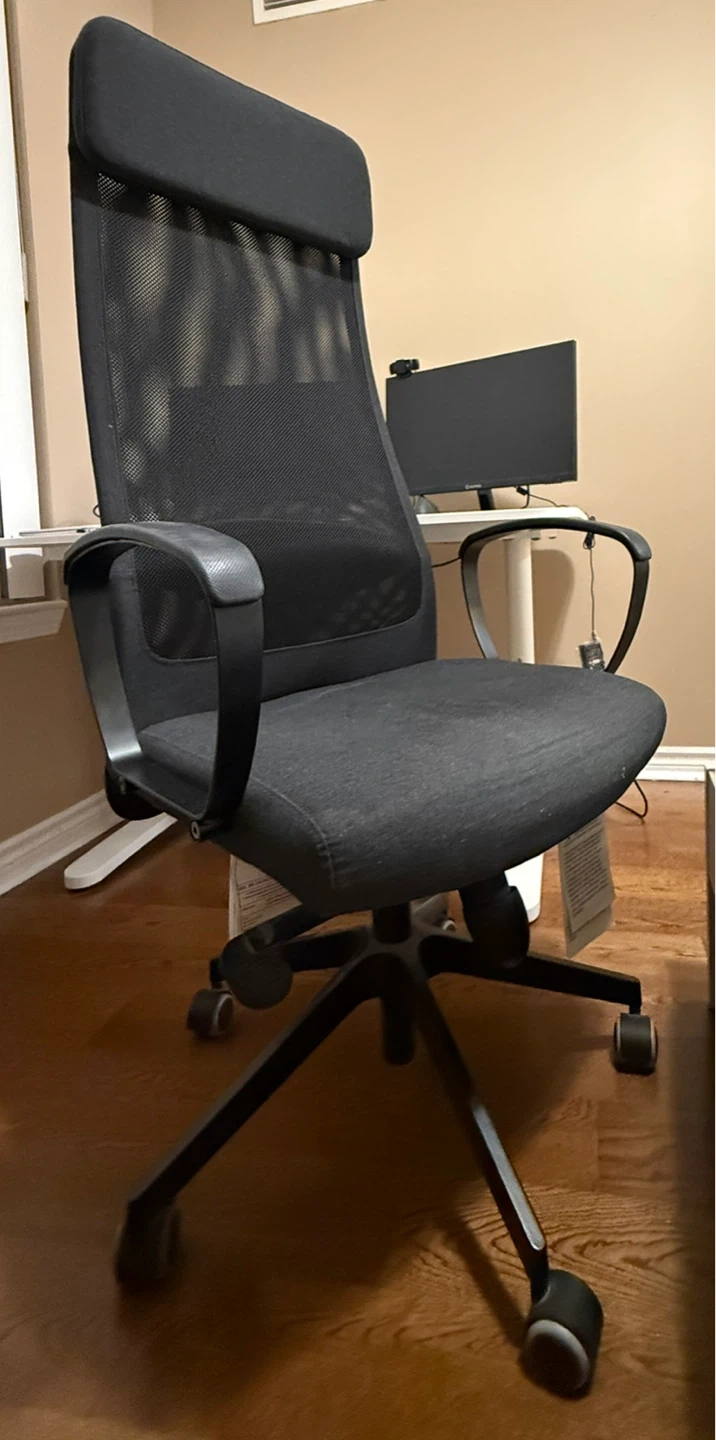 Selling an IKEA Bekant desk in white, sized at 63x31 1/2". It's in great shape and ready for a new home! Also included is a Markus office chair in Vissle dark grey, size large. Both items are from IKEA and are in good condition!