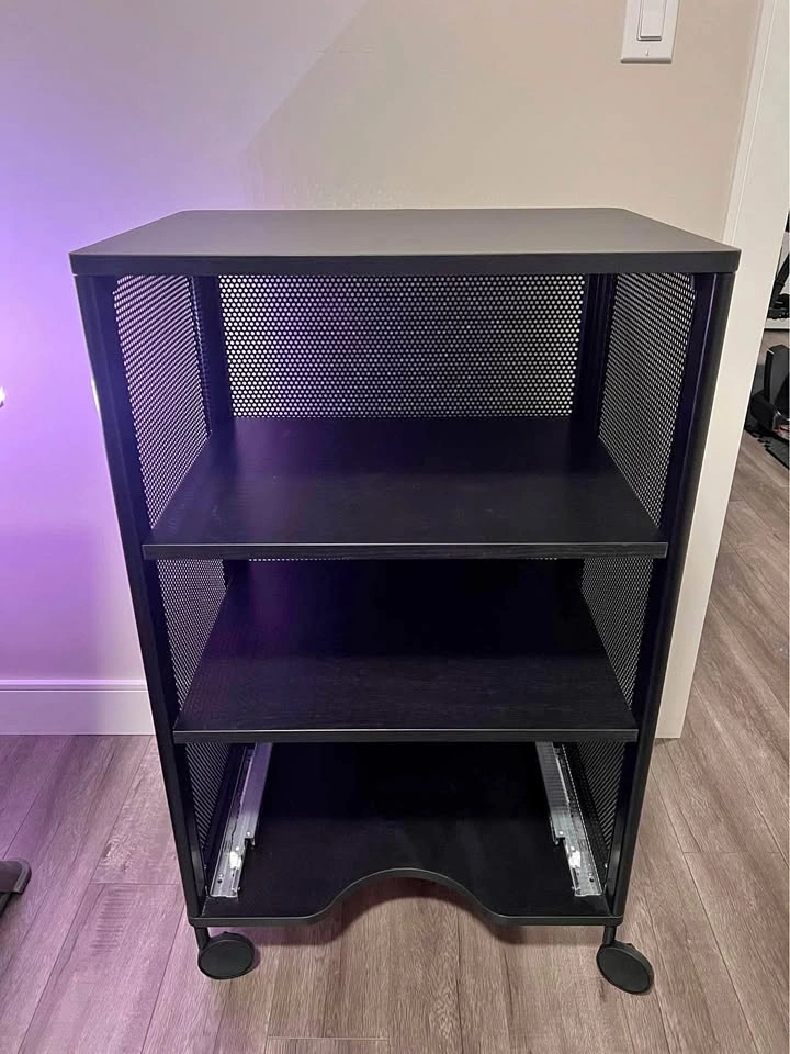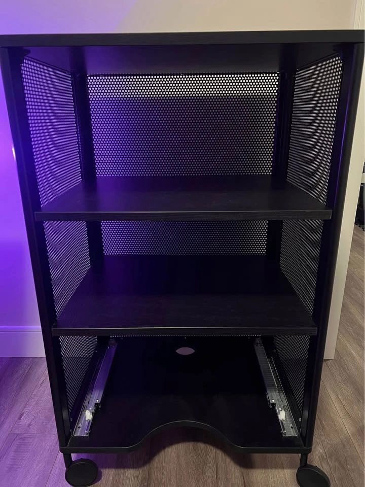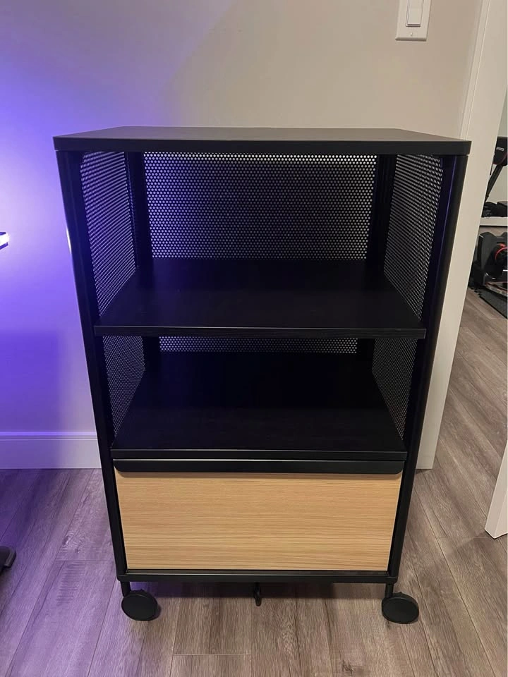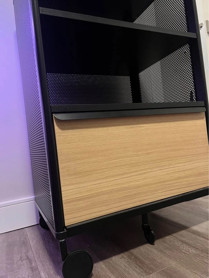 VERY RARE Suitable for business use. Width: 61cm (24 inches) Height: 101cm (40 inches) Depth: 45.5cm (18 inches) Integrated damper closes the drawer silently and gently. You can manage your cables easily thanks to the convenient hole at the bottom. You can customize and personalize your storage by putting magnets on the outside. Easy to move where it is needed thanks to casters. The shelf inside can be adjusted or removed so you can store things of different sizes. Designer Eva Lilja Löwenhielm Material Top panel/ Shelf: Particleboard, Ash veneer, Stain, Clear acrylic lacquer, Plastic edging Side panel/ Back panel/ Pen holder: Steel, Epoxy/polyester powder coating Poles: Aluminum, Epoxy/polyester powder coating Bottom panel: Particleboard, Ash veneer, Stain, Clear acrylic lacquer, Paper foil, Plastic edging Drawer front/ Drawer side/ Drawer back: Particleboard, Ash veneer, Plastic edging, Stain, Clear acrylic lacquer Drawer bottom: Particleboard, Ash veneer, Stain, Clear acrylic lacquer Care Wipe clean with a mild soapy solution. Wipe dry with a clean cloth. For increased stability, re-tighten the screws about two weeks after assembly and when necessary.