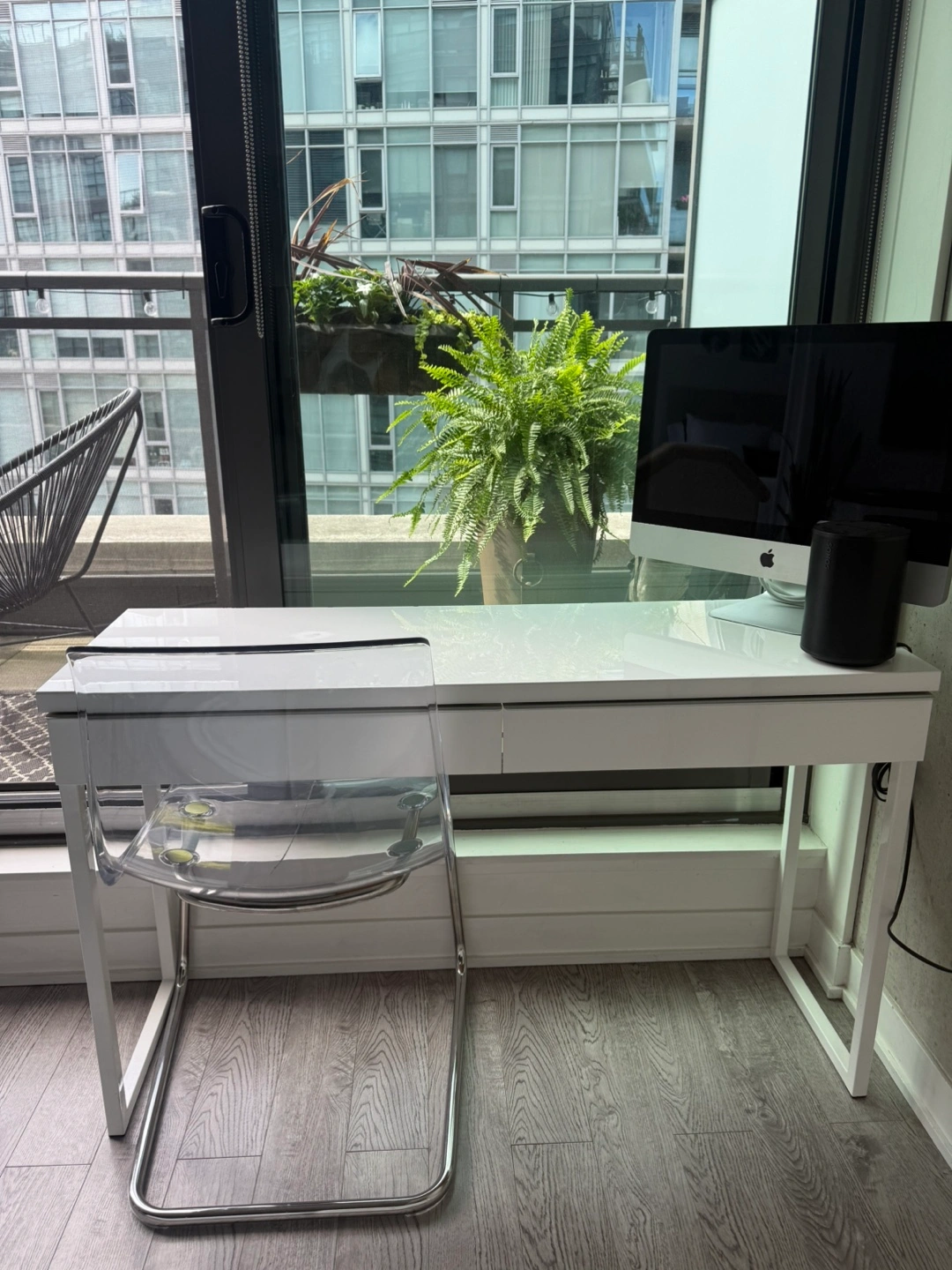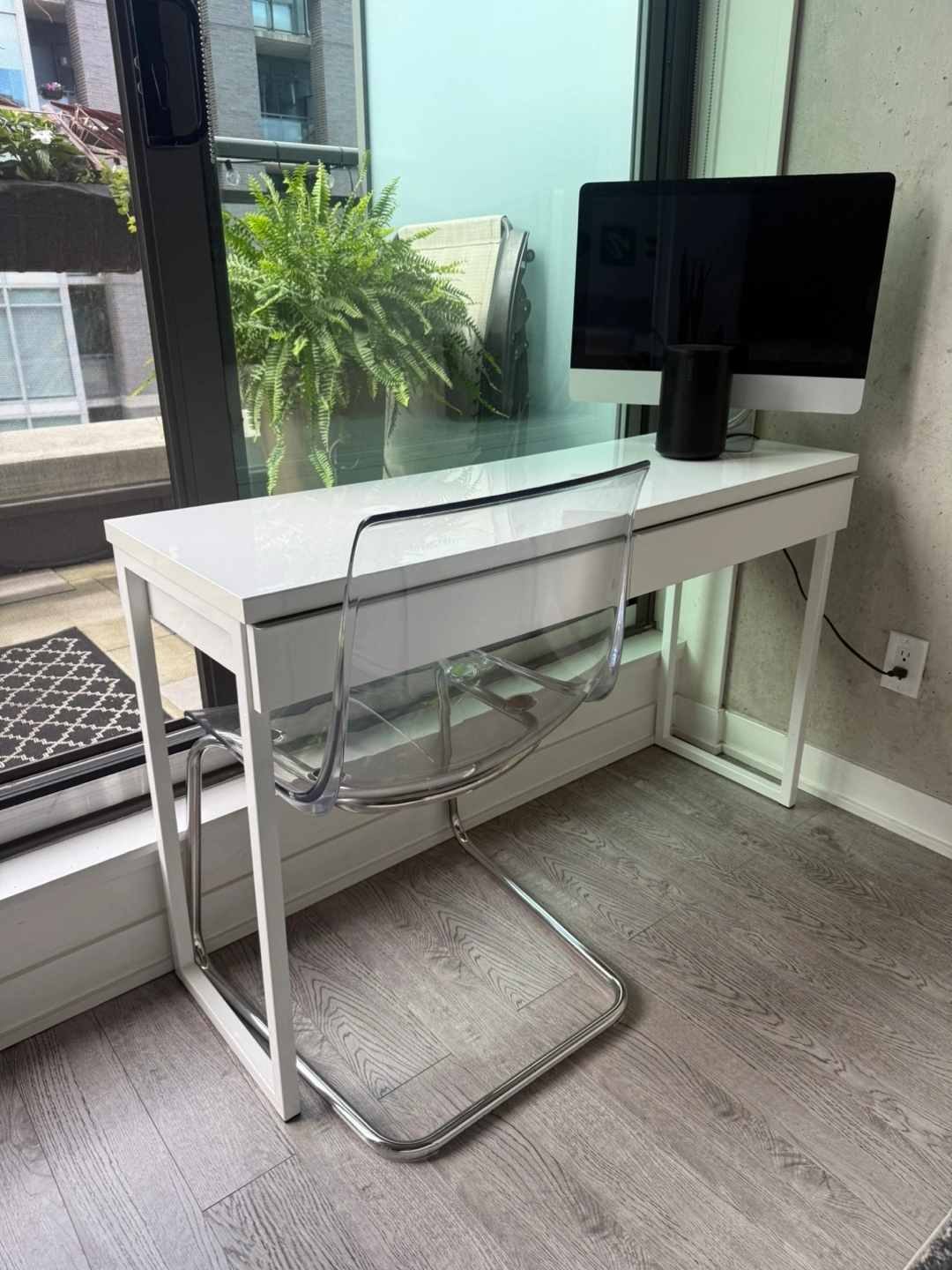 Selling a white IKEA BESTÅ BURS Desk, high-gloss white, 120x40 cm It's in great shape and ready for a new home! Perfect for apartments and small spaces! Key features: - Stylish desk with a simple design and slim lines. - Compact and easy to place, even in the middle of a room thanks to its finished back. - Two practical drawers for things you want to keep close at hand.