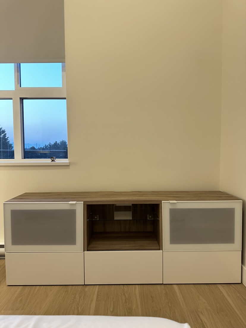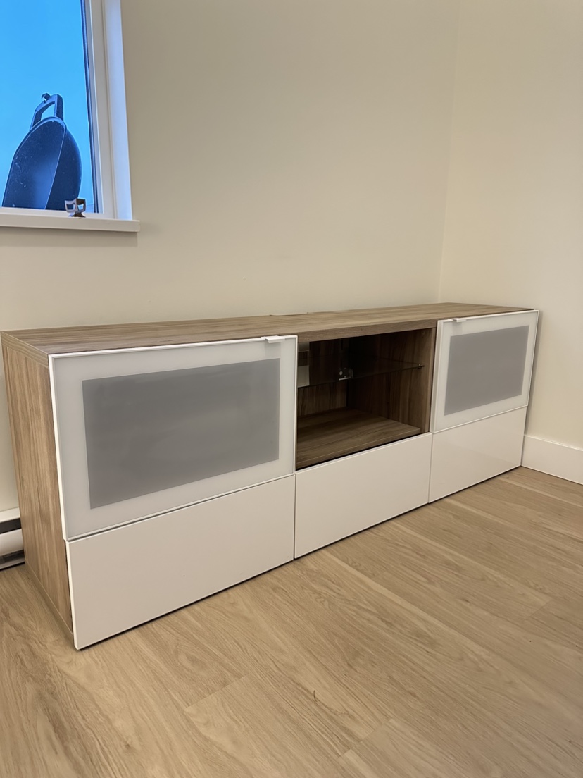 10Large TV unit with white doors and drawer fronts. Includes two doors with frosted glass panels, one open shelf, and two drawers. Purchased 2 years ago and it’s in a very good condition with a barely visible minor scratching. Doors and drawers function perfectly. I can a share a video of it if you want. Selling it because of living room redecoration. I can offer to drop off only if location is nearby. Location: North Delta, near Sunshine Hills