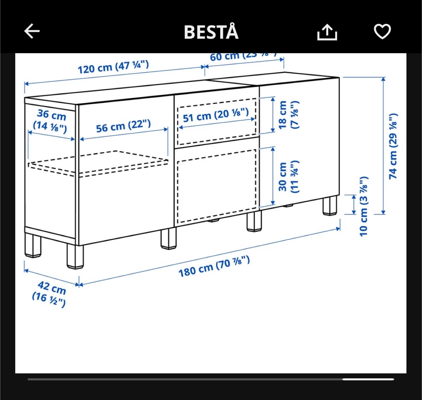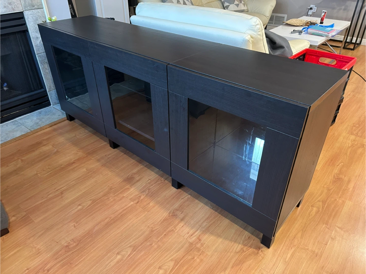 15Selling an IKEA BESTA media unit in black-brown. It's in great shape and ready for a new home. The dimensions are approximately 180cm (70 7/8") wide, 42cm (16 1/2") deep, and 74cm (29 1/8") tall. Perfect for your living room or entertainment area!