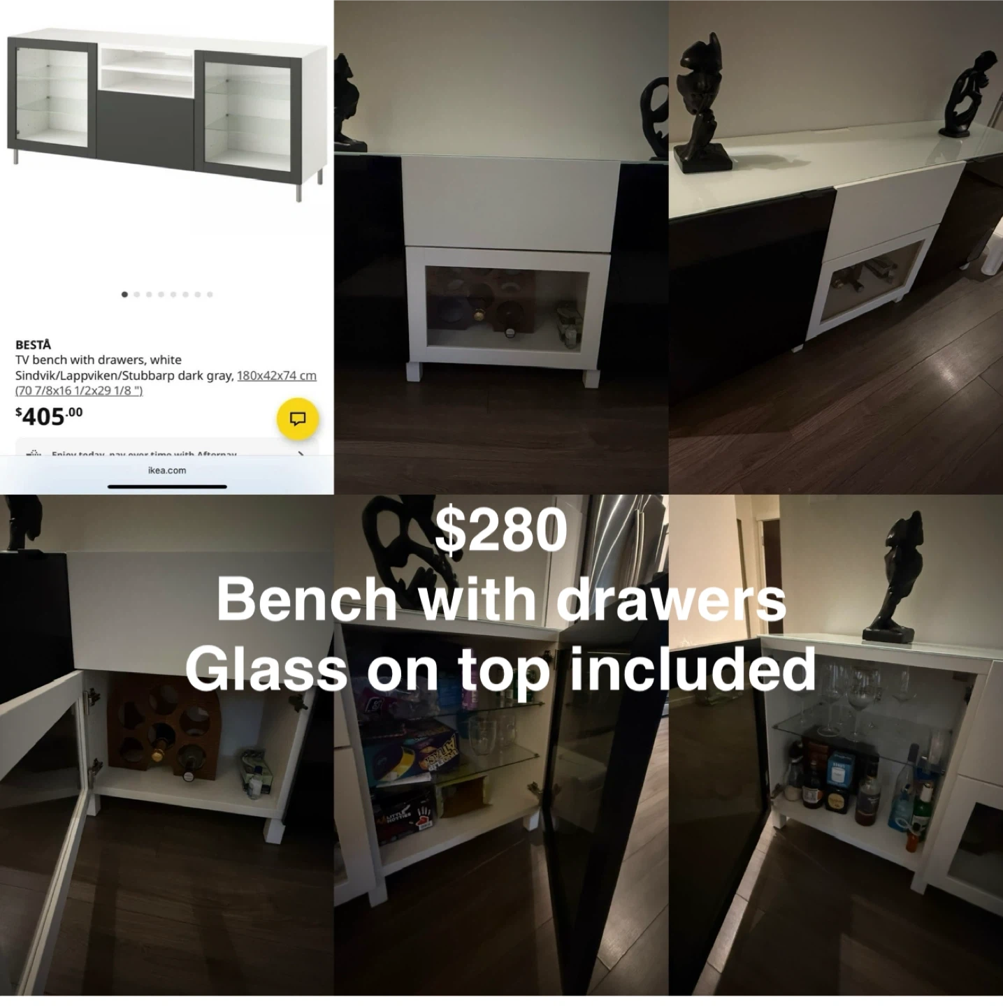 10Selling an IKEA BESTA TV bench with drawers in a stylish white and dark gray colour combo. It's in good condition and perfect for organizing your entertainment area. Dimensions are 180x42x74 cm (70 7/8x16 1/2x29 1/8 ")