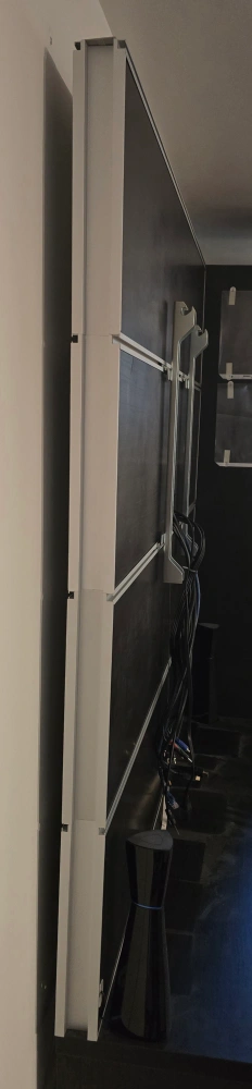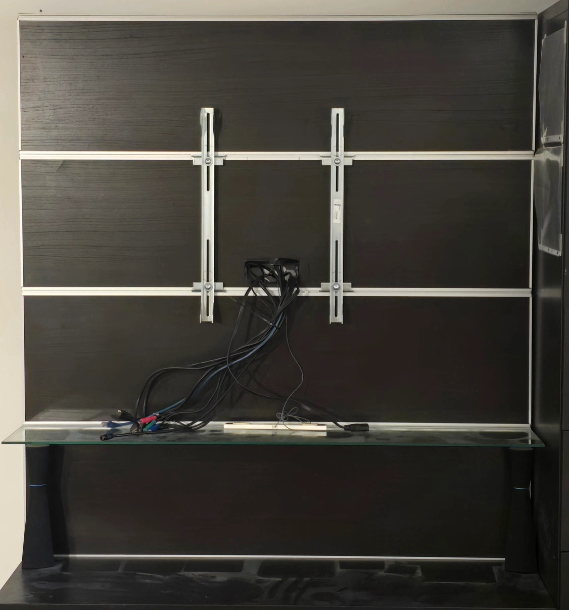 Selling a wall-mounted entertainment unit. It features a dark wood-look backing with silver-tone metal supports and a glass shelf. It's in great shape and ready to add some style to your living room!