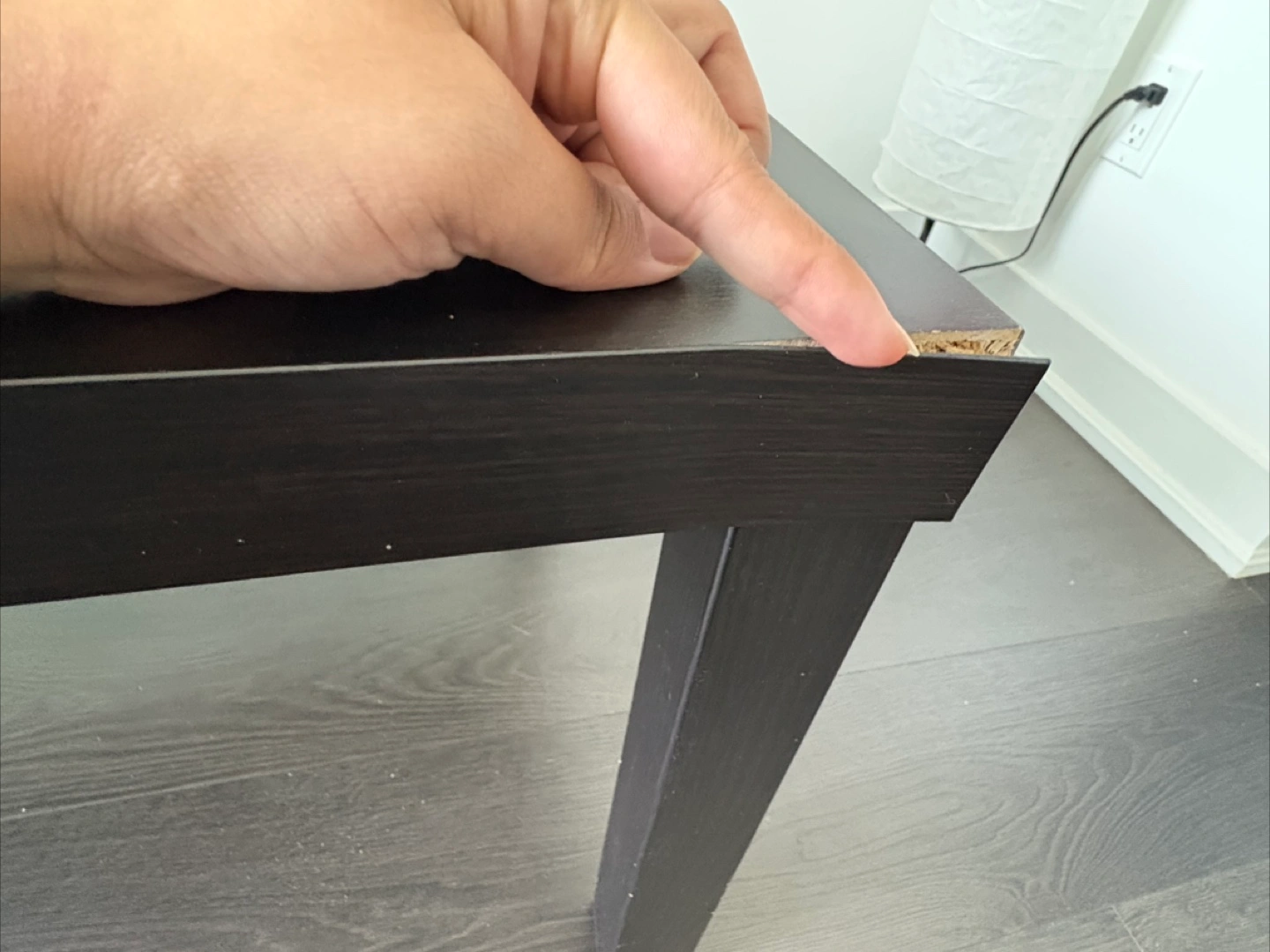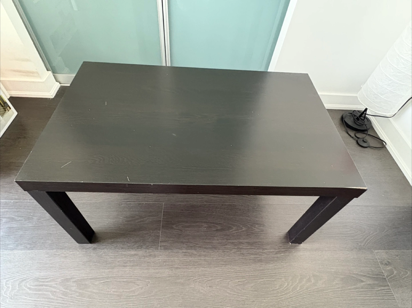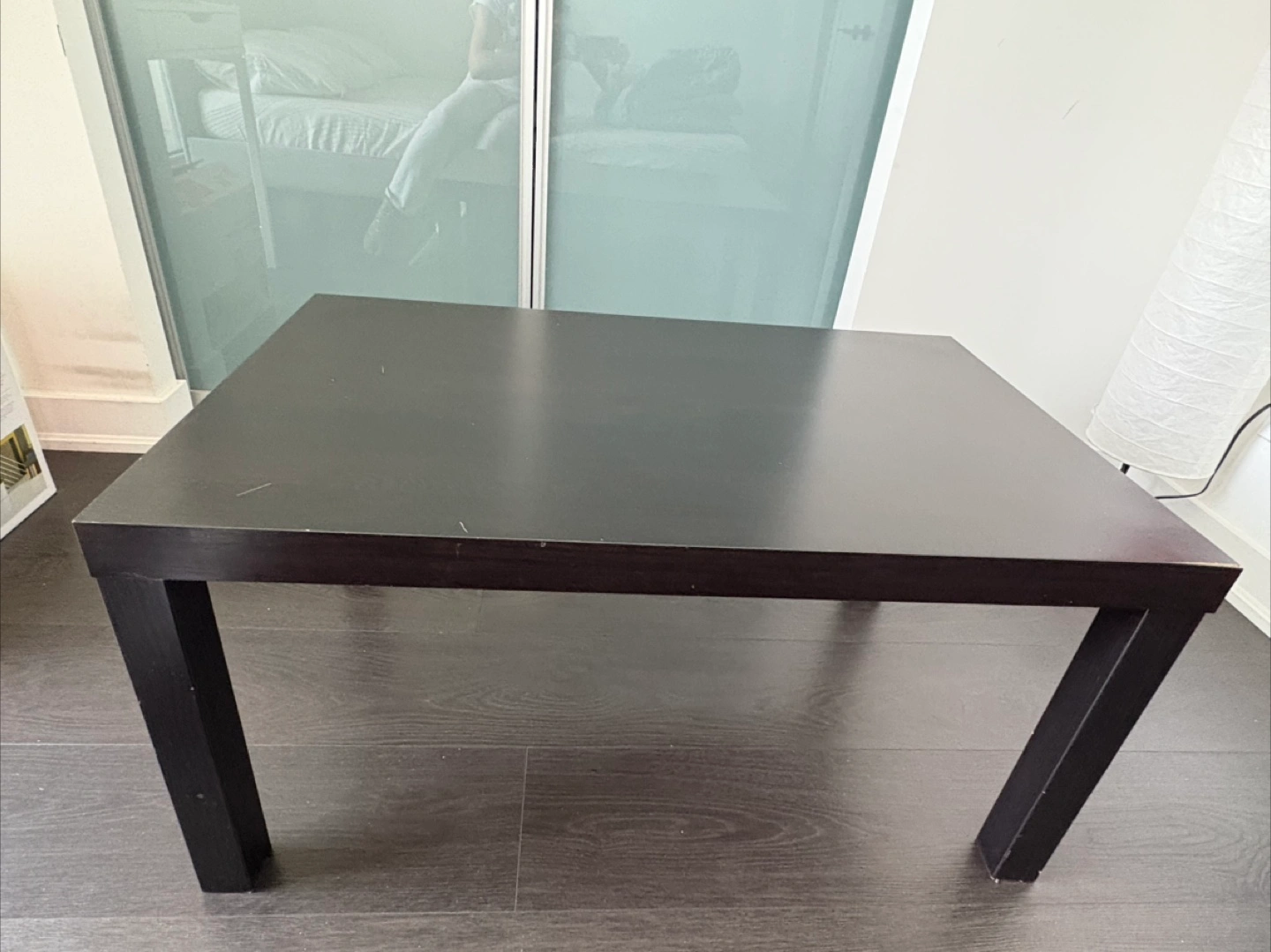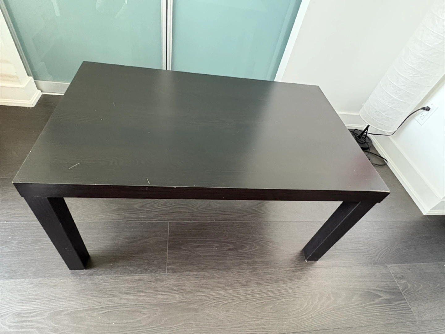 Selling a used Ikea table in black-brown. Only a small side panel is loose from age and can be fixable with glue and minor tears are there( visible in pictures) It's a sturdy table and perfect for small spaces