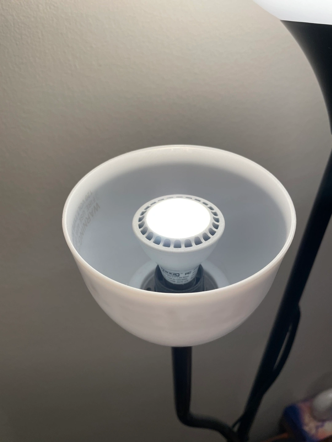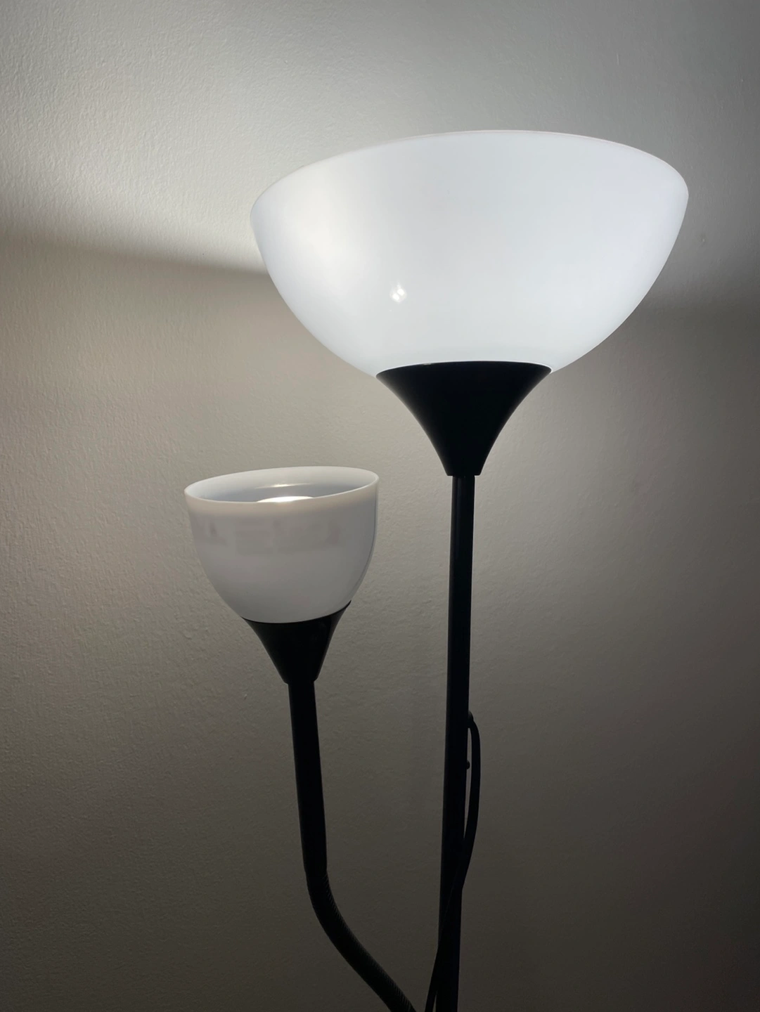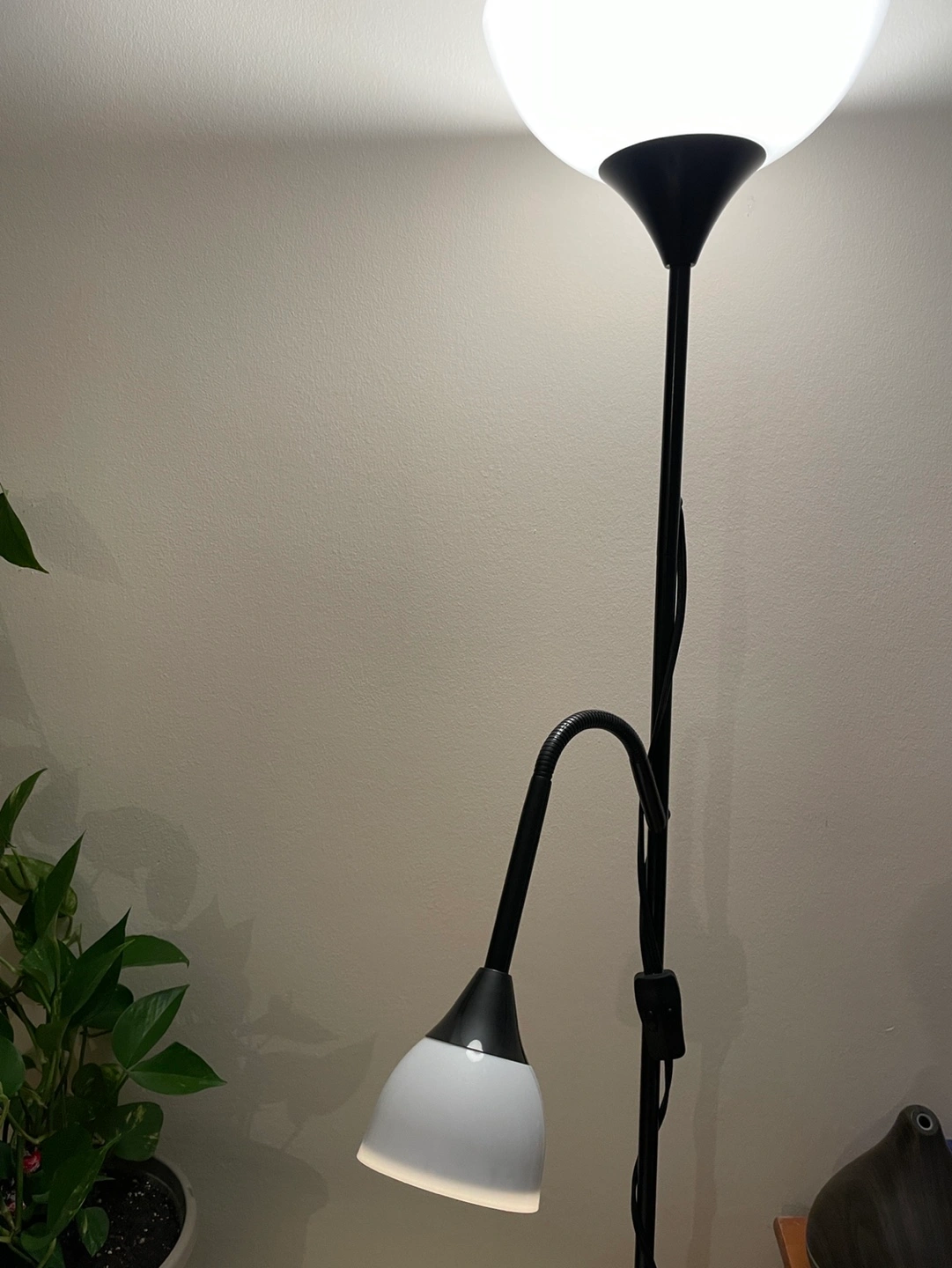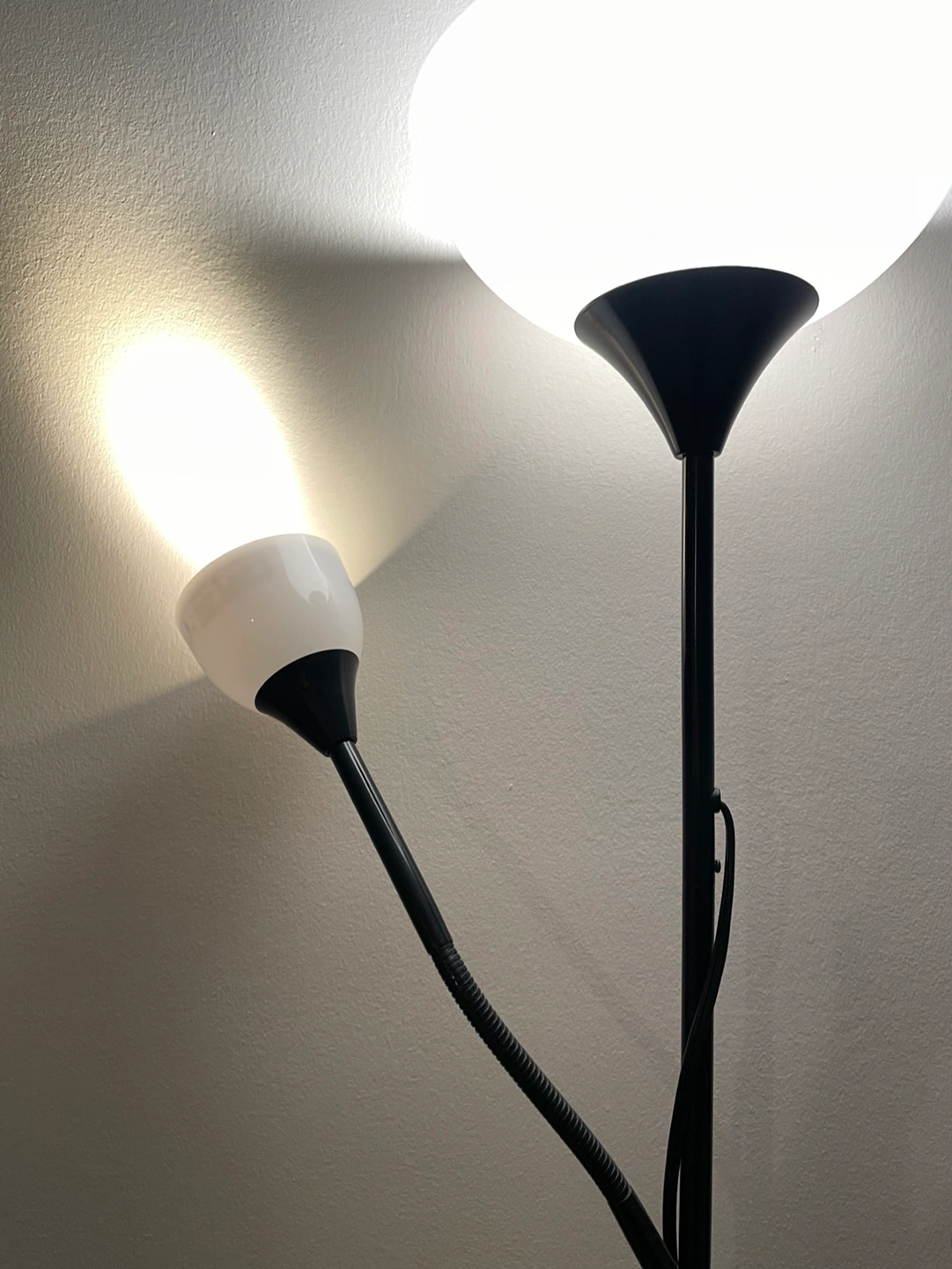 162Two-light floor lamp with a flexible reading light arm. Black metal frame and white shade. In new condition.