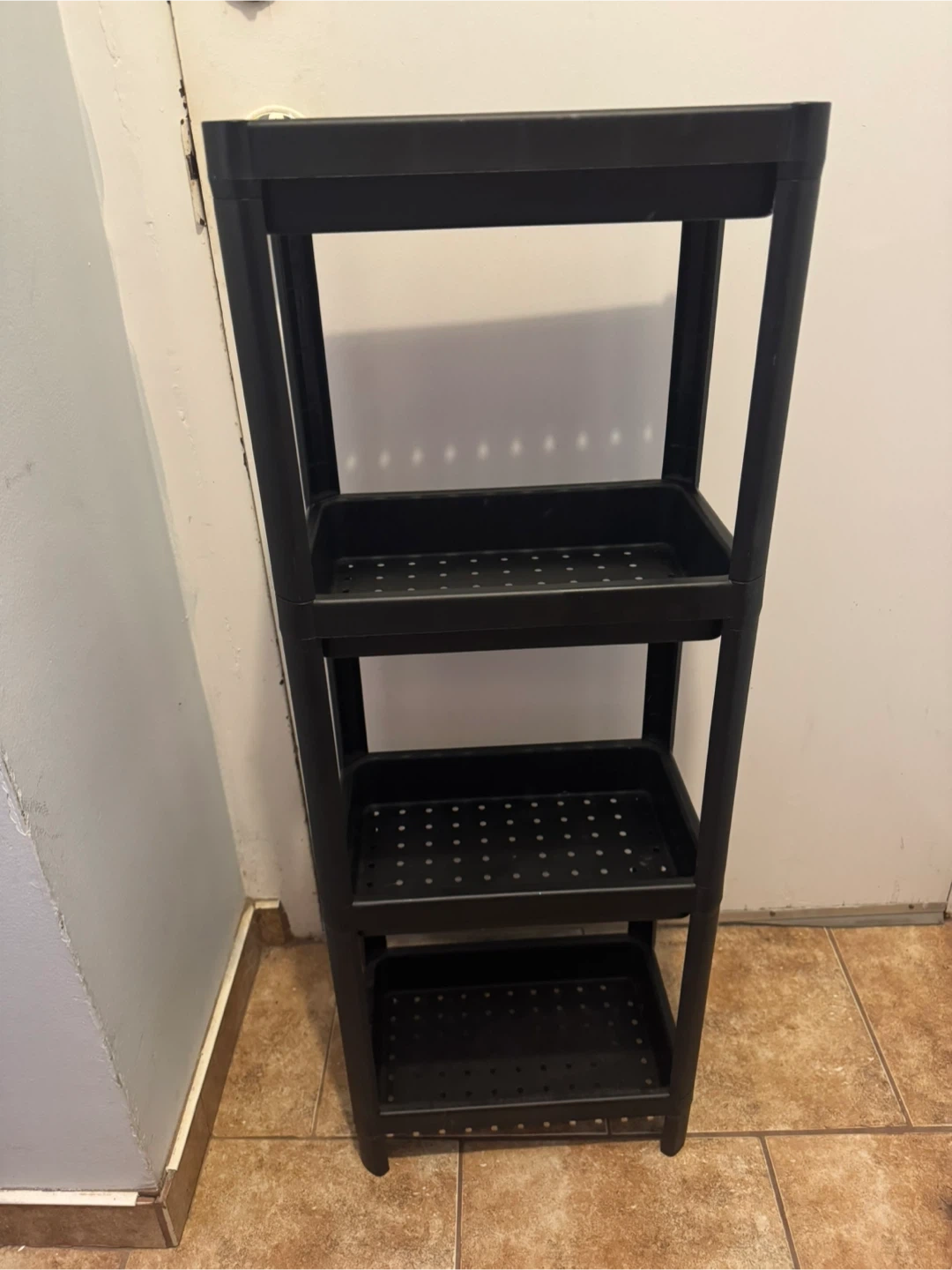 40This is a handy black plastic shelf with four tiers! It's great for organizing things in a small space, whether it's in the bathroom, kitchen, or even a closet.