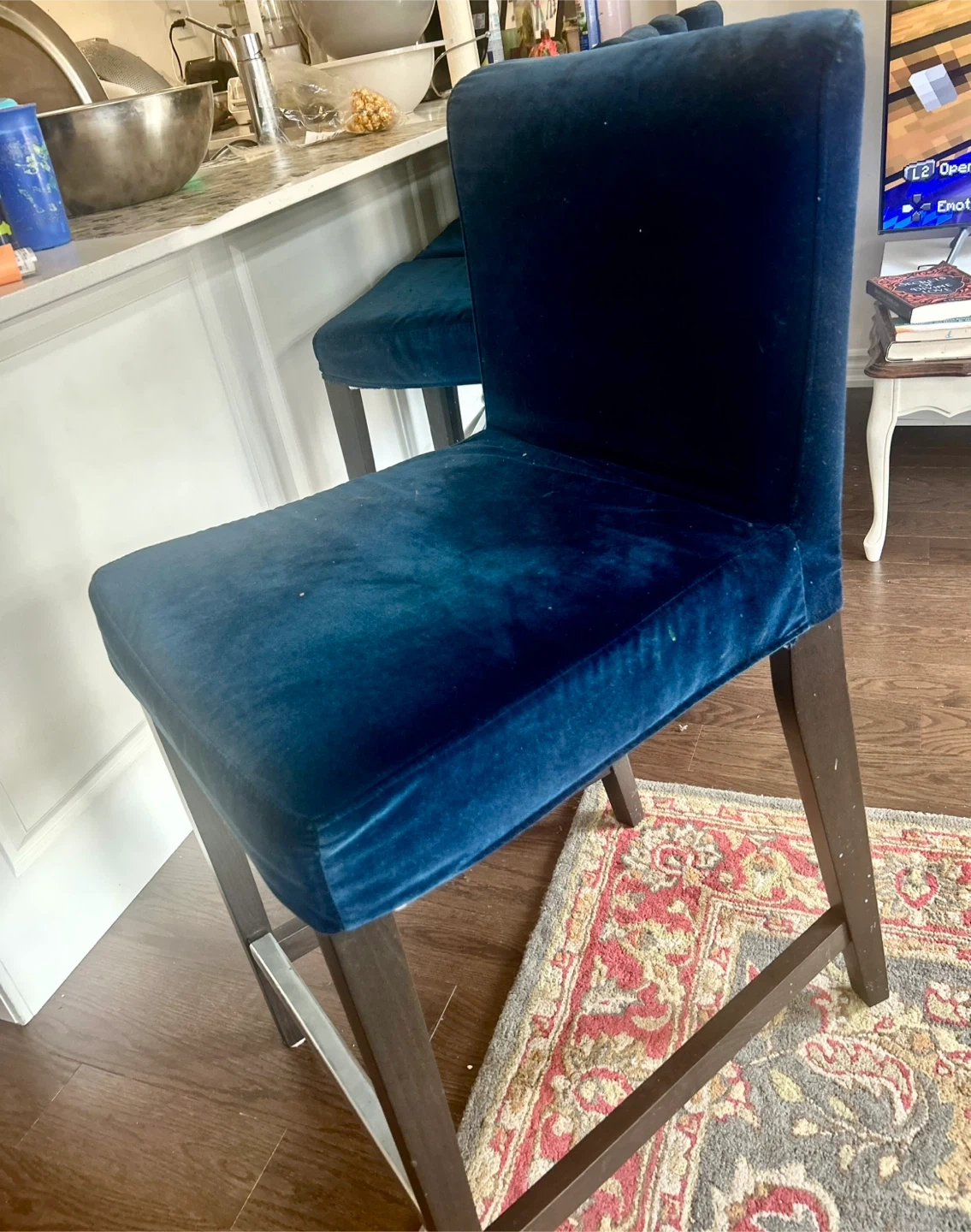 16Selling a stylish bar stool with a comfy blue velvet seat and back. It's in good shape and would look great in any kitchen or bar area! https://www.ikea.com/ca/en/p/bergmund-bar-stool-with-backrest-counter-height-black-gunnared-medium-grey-s59471786/