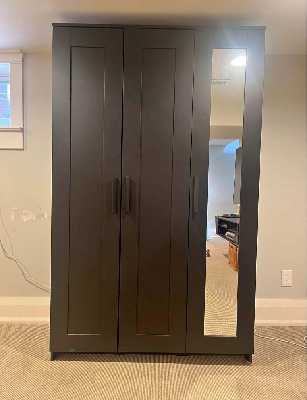 Selling an Ikea brimnes wardrobe in black. It's in great condition and ready to organize your space! The wardrobe features multiple shelves and doors, providing ample storage. Perfect for bedrooms or closets!