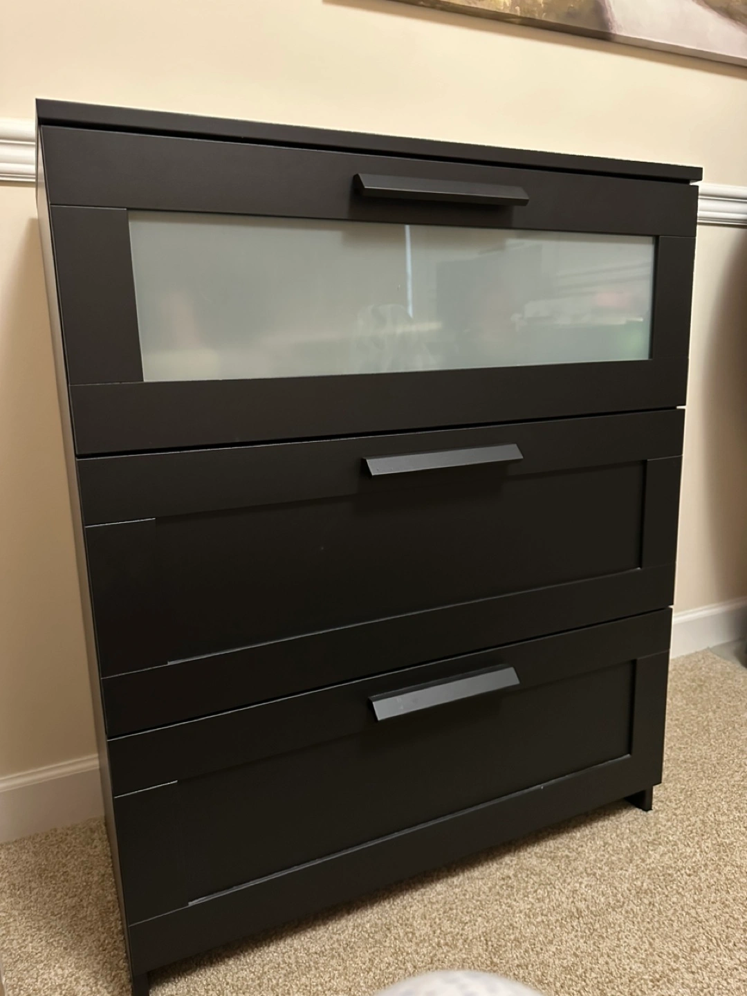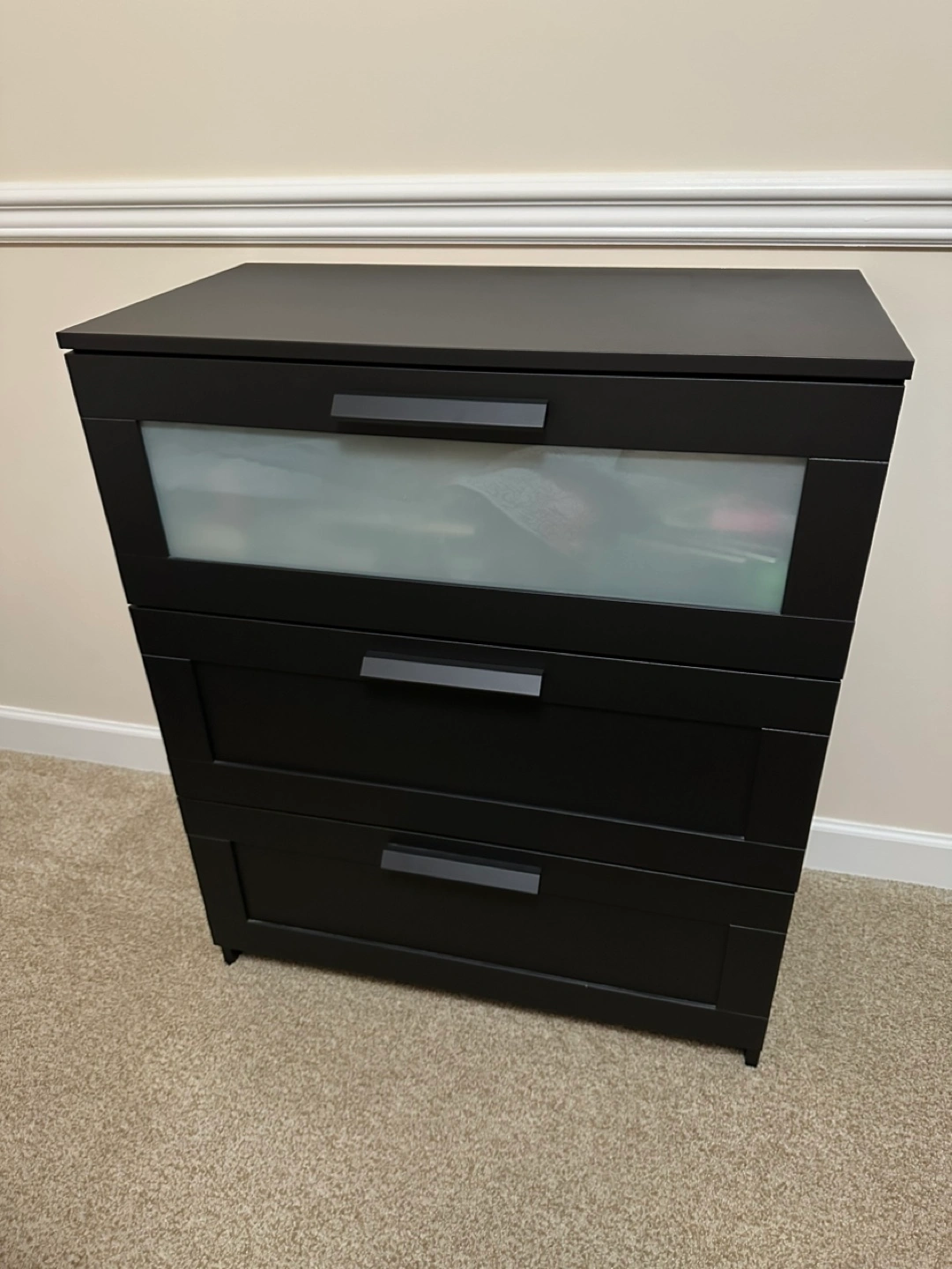 223BRIMNES 3-drawer chest, white, 78x95 cm (30 3/4x37 3/8 ") Black dresser with three drawers, one with a frosted glass front. Excellent condition.