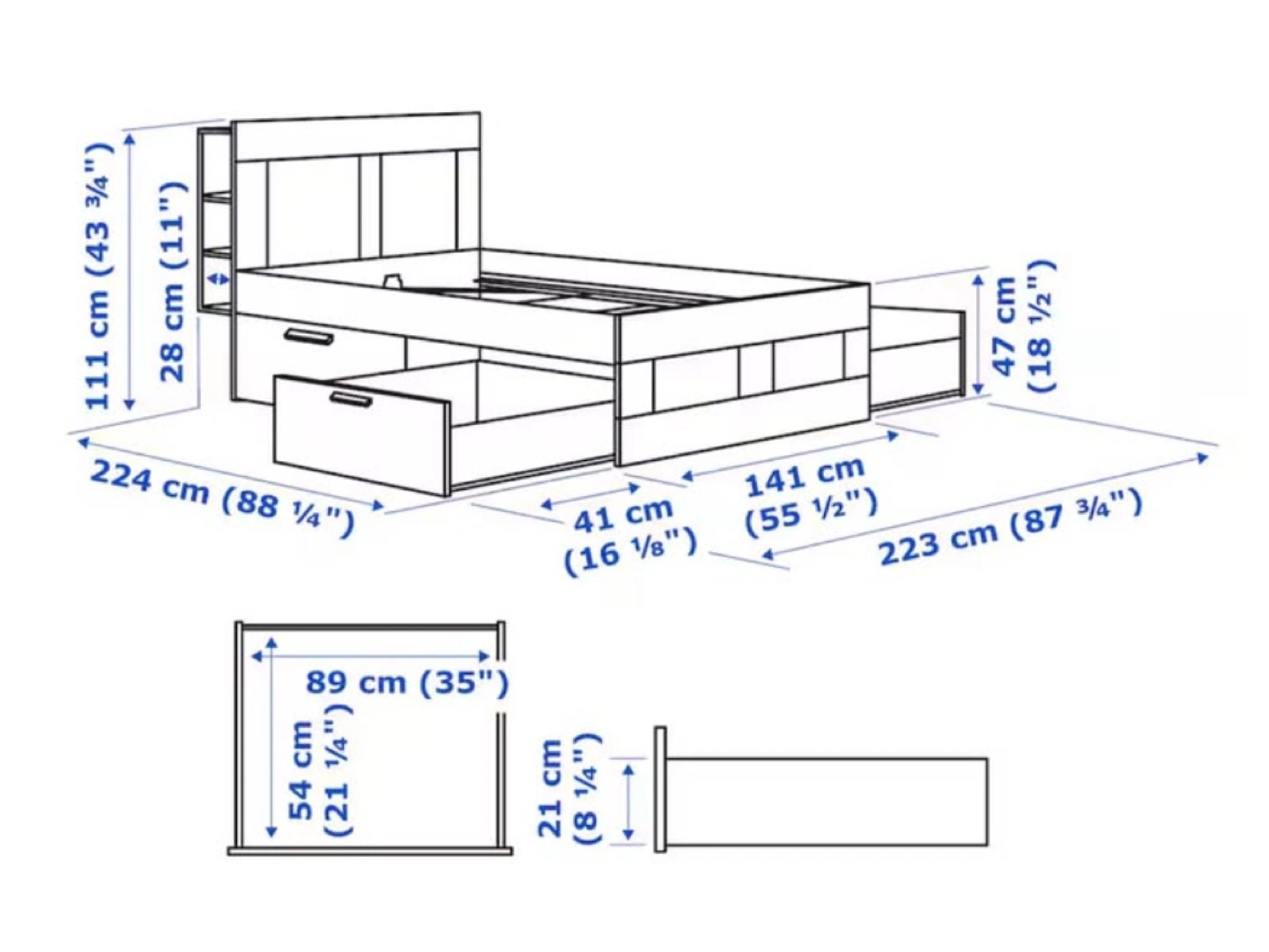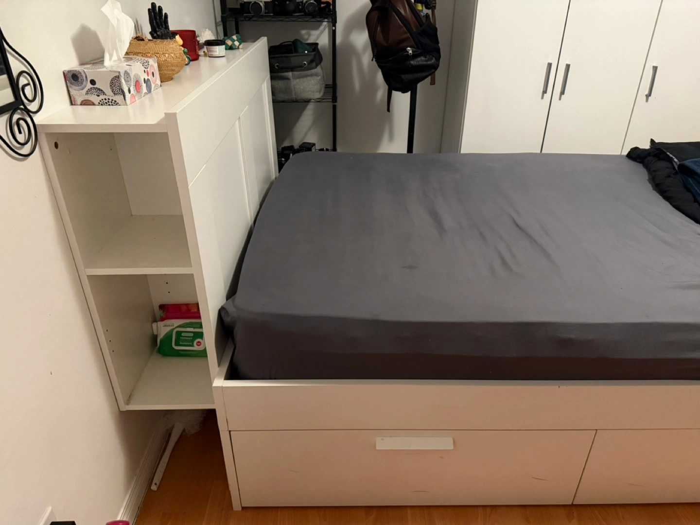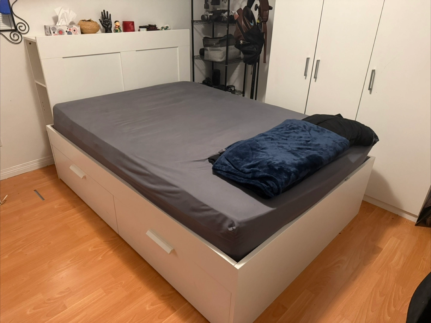5Double bed with 4 large drawers and a headboard with shelves. Great for small space living. Amazing condition, strong and sturdy. Some signs of wear. Selling it because I no longer need an extra bed in my place. Retail price: $519 You can take the mattress for free if you want to. Please bring a van to pick it up. We will give it to you disassembled. Original IKEA assembly manual included.
