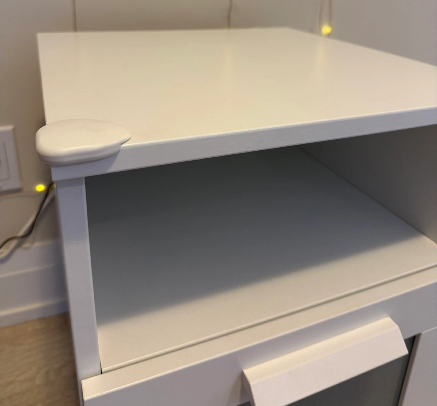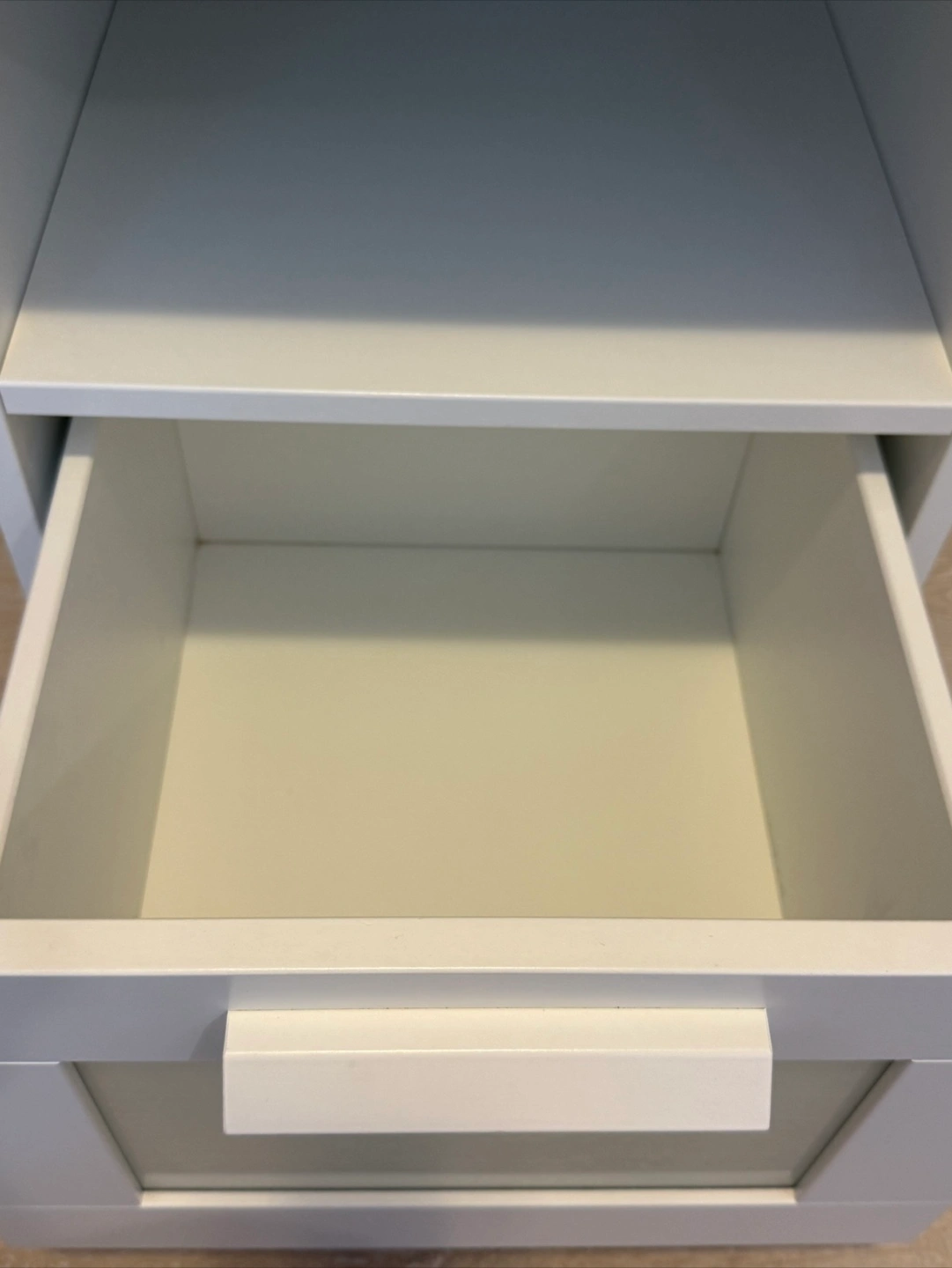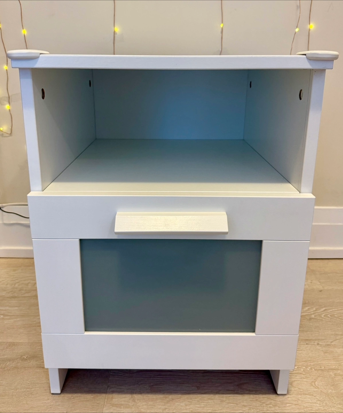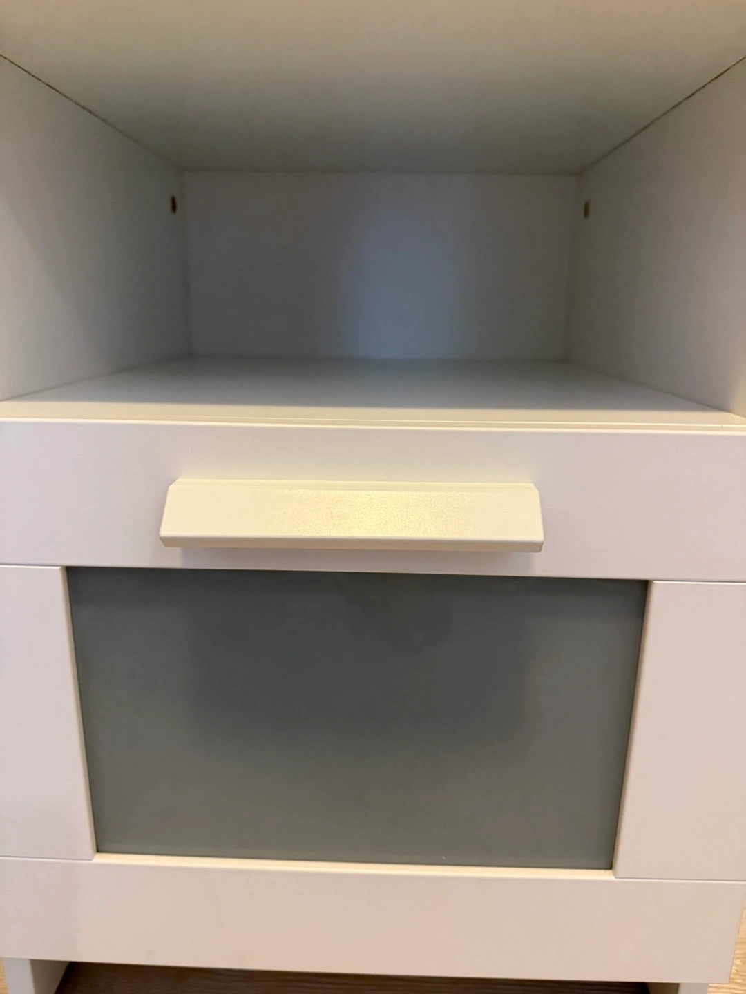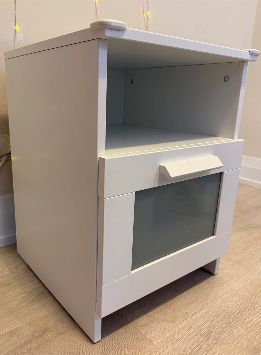Selling IKEA BRIMNES Nightstand, white with drawer. It is very gently used and is in absolute mint condition. It has a drawer with a frosted glass front and an open shelf on top for easy access to your nighttime essentials. Dimensions: 39X41X53 cms