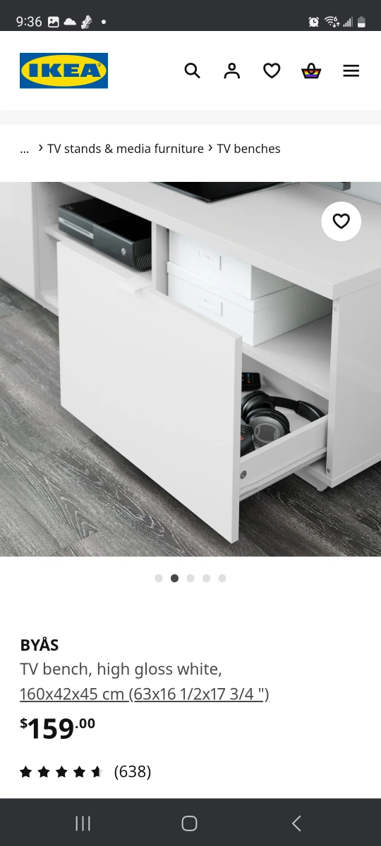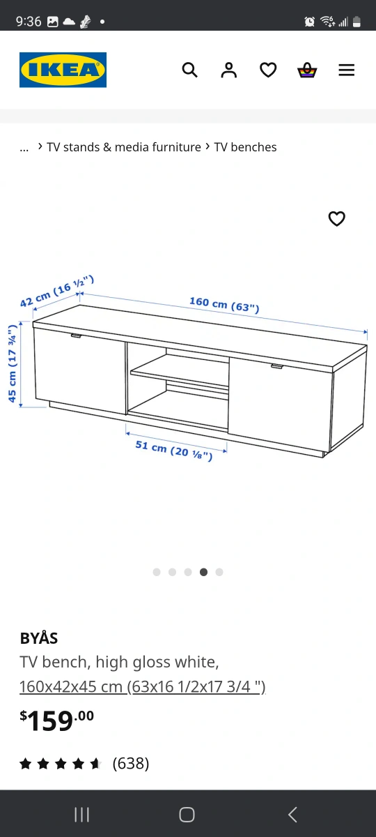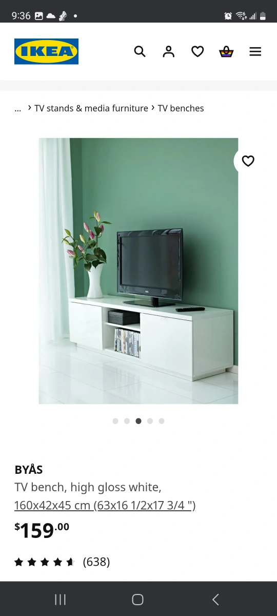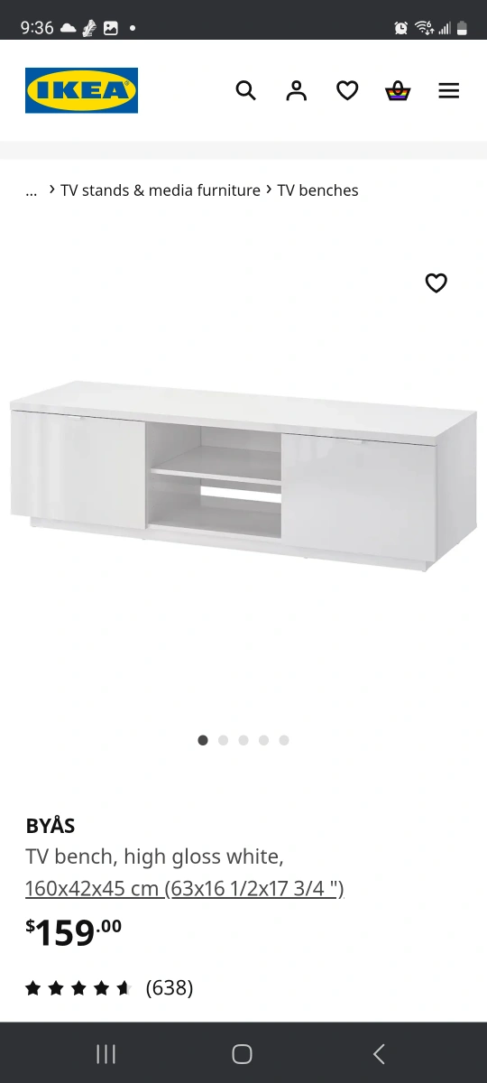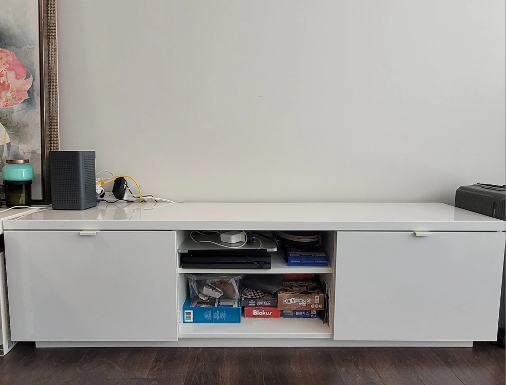 A sleek white TV bench. Features two doors and open shelving. Excellent condition! I bought this from IKEA for $178. high gloss white 160x42x45 cm (63x16 1/2x17 3/4 ")
