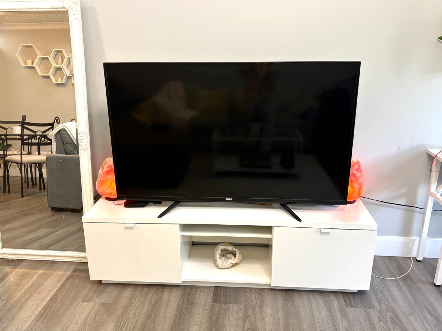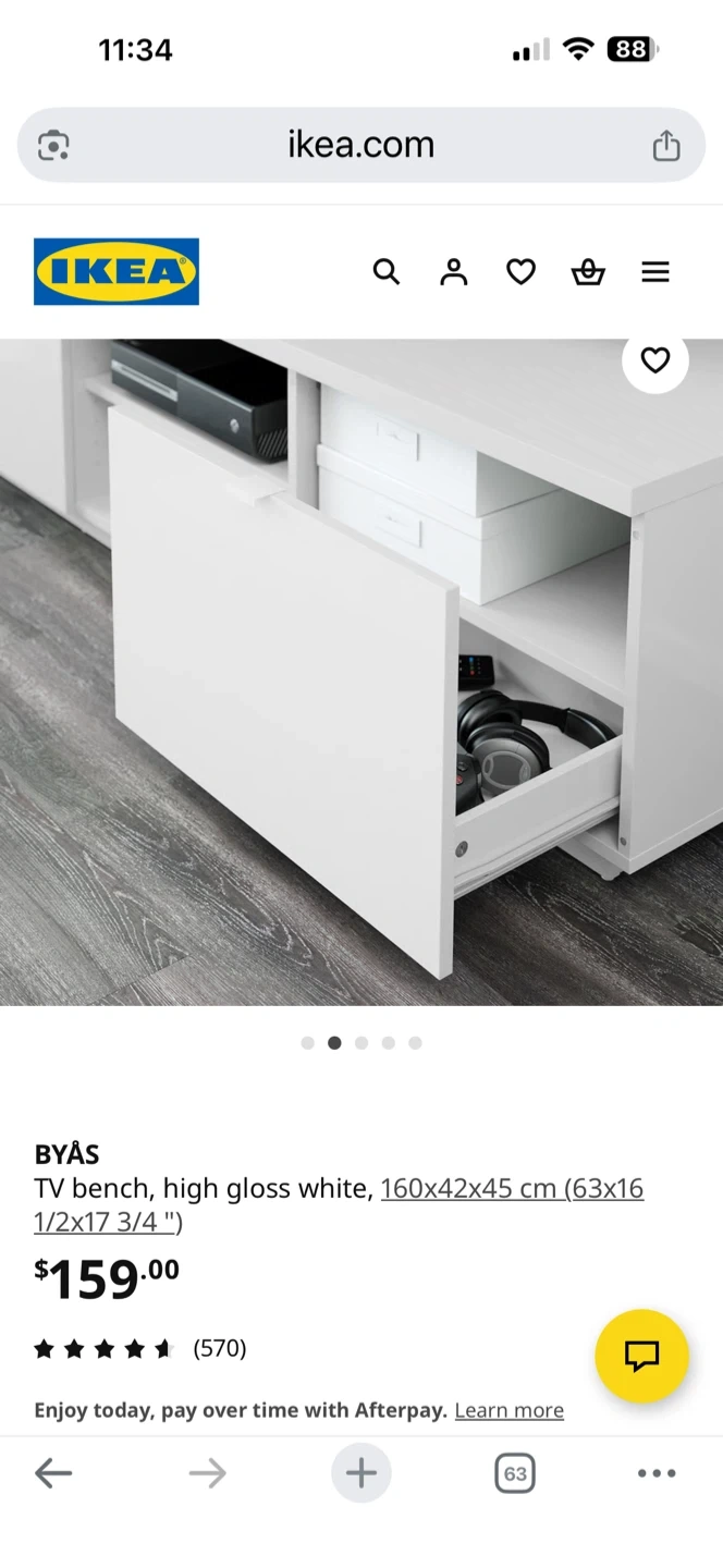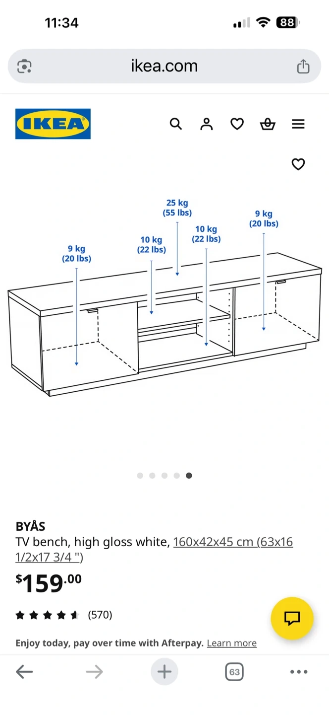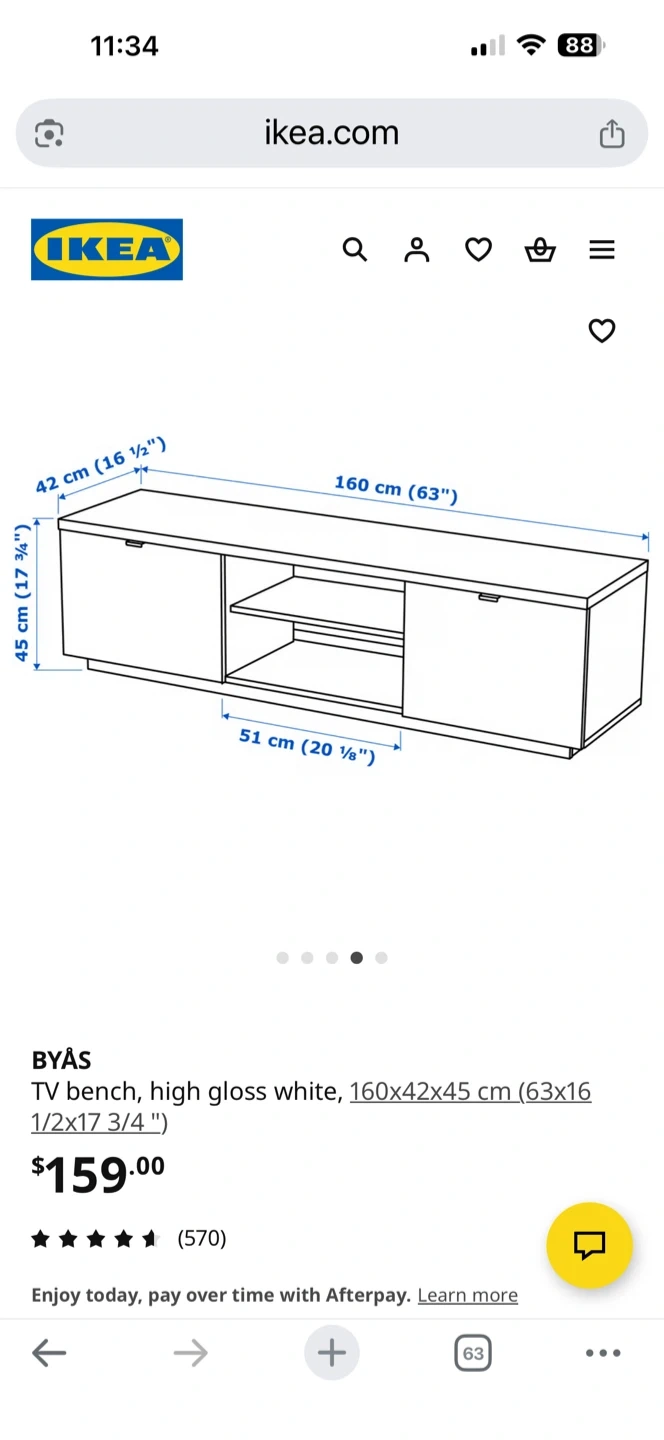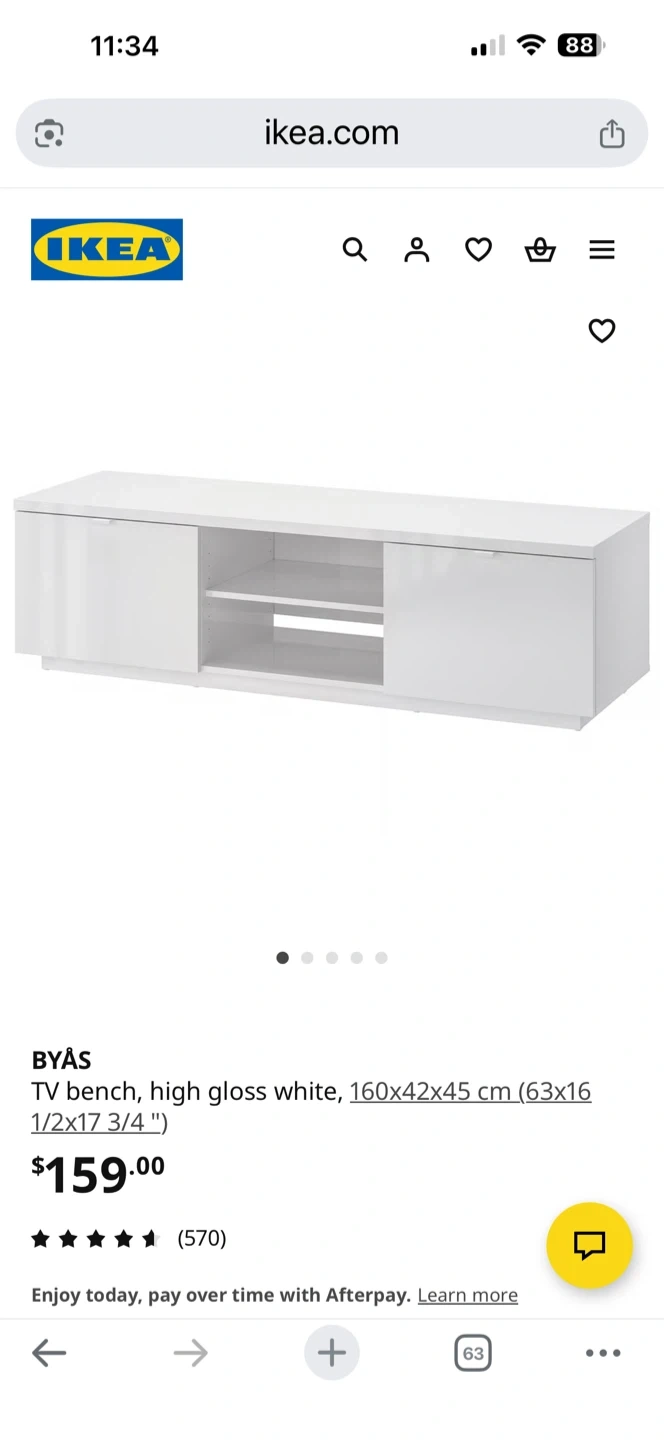 15Selling a white IKEA BYÅS TV bench in great condition! It's 160x42x45 cm (63x16 1/2x17 3/4 "). Originally bought for $159 Some yellowing on the side of the unit, not very noticeable. Price reflects it.