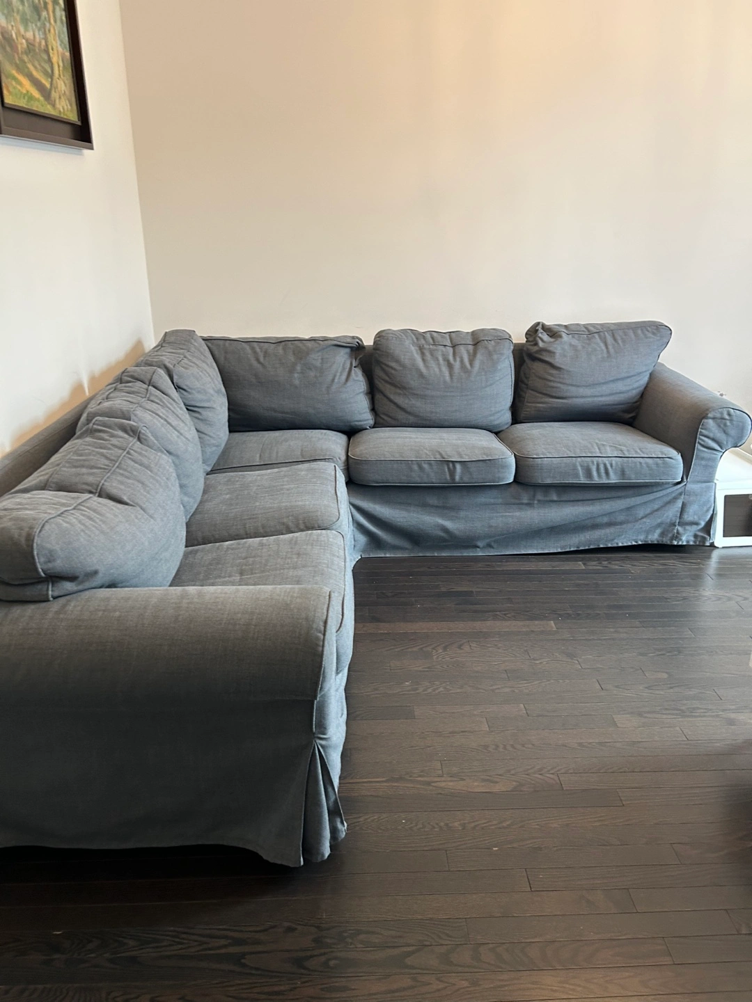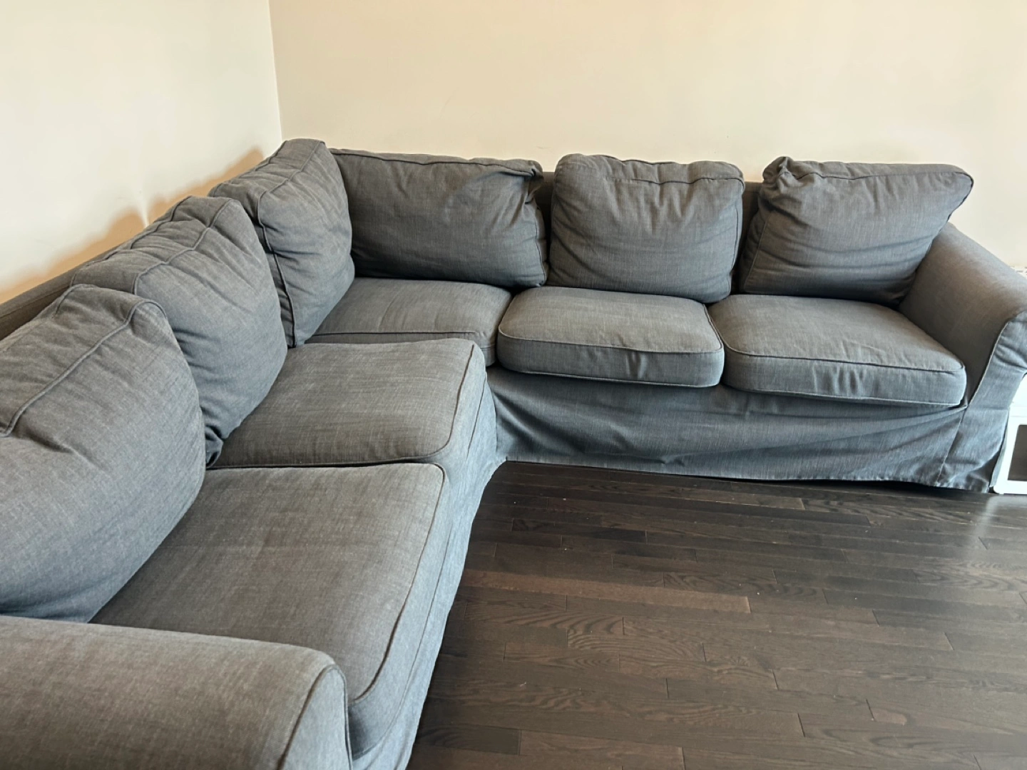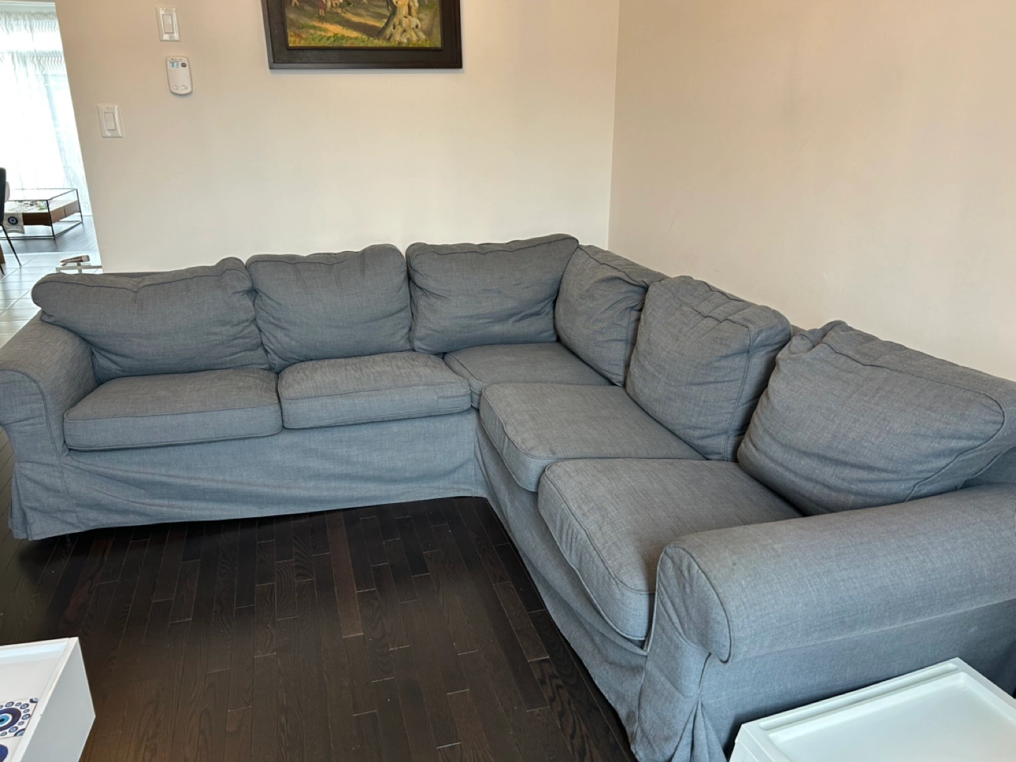 71Grey fabric sectional sofa. Comes with removable cushions. Good condition. Located in a living room. Required to be moved through a stair (about 10 steps). Buyer is expected to disassemble and move out to their vehicle, which could be parked at the driveway.